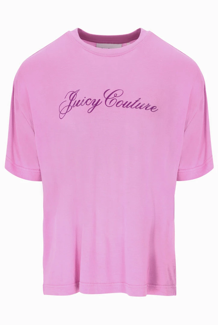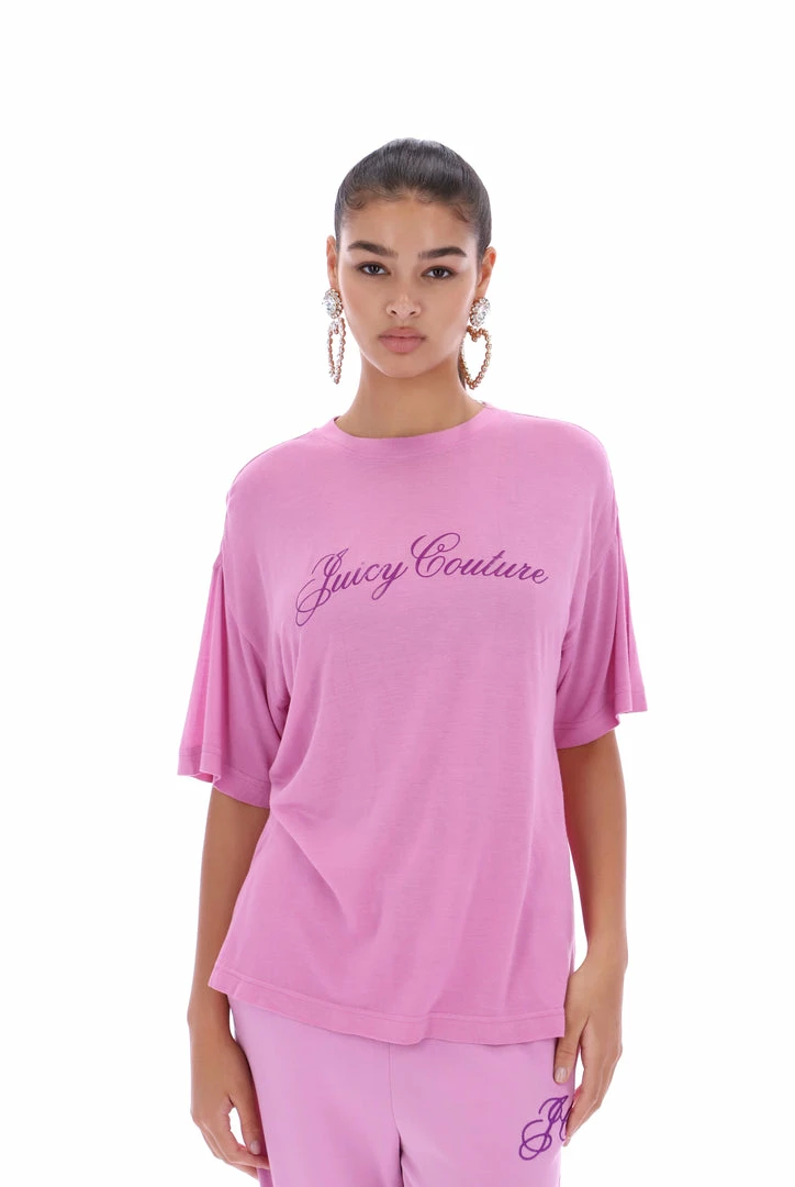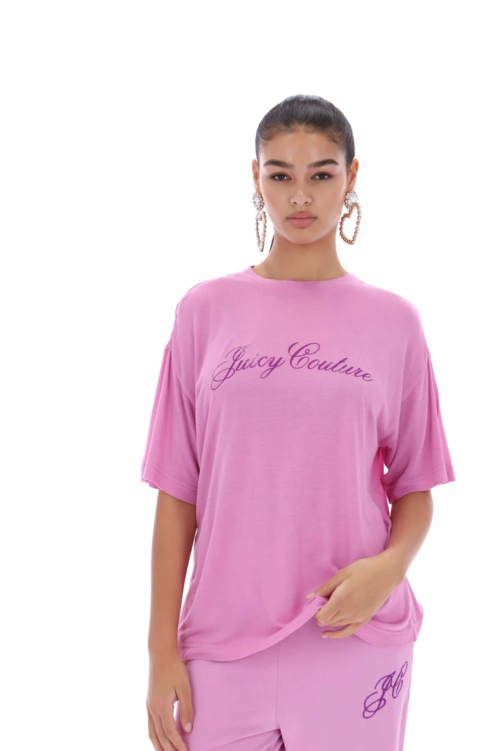 Introducing our sustainable development range. Bamboo blend t-shirt in orchid jersey. This boyfriend fit tee is soft to touch; made with a natural, renewable fibre yarn and is branded with ‘Juicy Couture’ through chest. Pair with the matching joggers for a relaxed loungewear look.