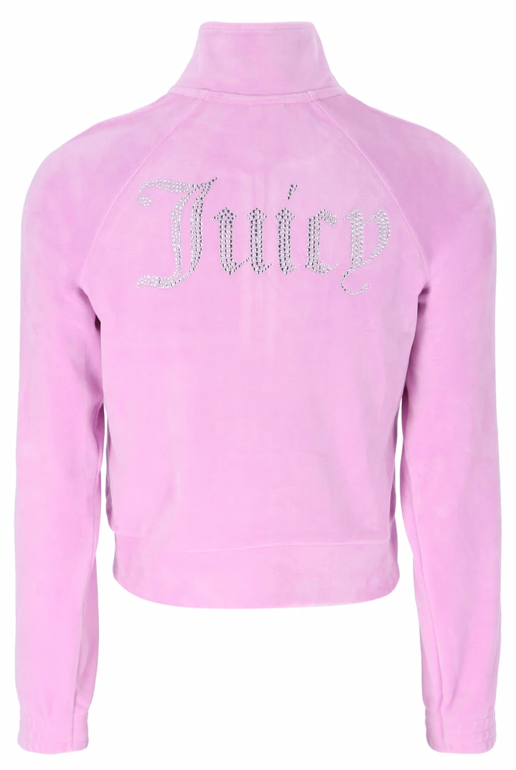 Diamante embellished track top in orchid classic velour. Slim fit zip-through style with a high neck, zipped pockets, smocked cuffs and a statement crystal diamante logo branding on the back. This track top is finished with a silver branded round zip pull. Pair with the matching bottoms for a full iconic Juicy Couture tracksuit.