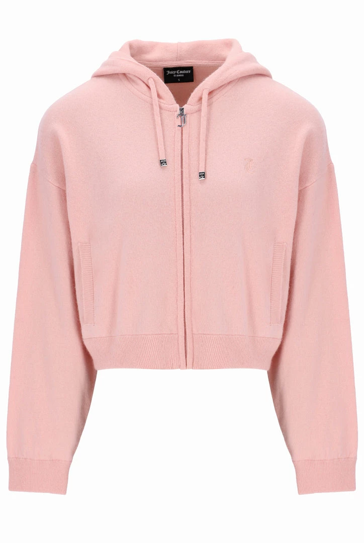 Zip through knitted hoodie in pale pink cashmere blend. Boxy fit with kangaroo pockets, this premium hoodie features a statement gothic J zip pull and is branded with a tonal embroidered JC logo at the chest