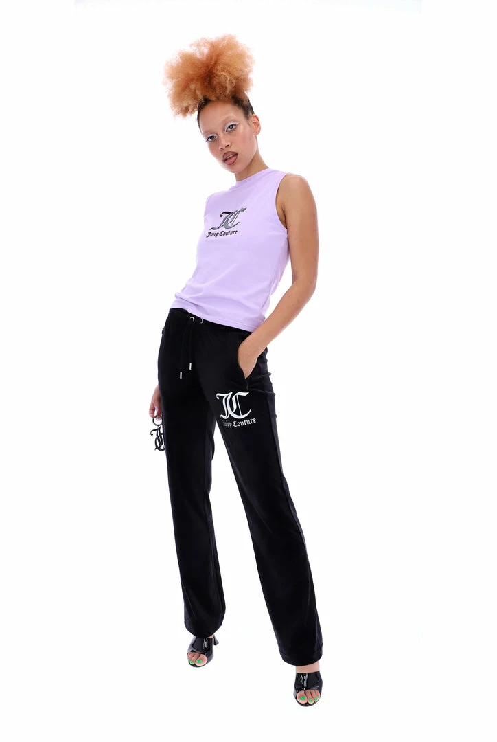 Sleeveless pastel lilac tank top. A crew neck style branded with a JC raised metallic graphic at chest.