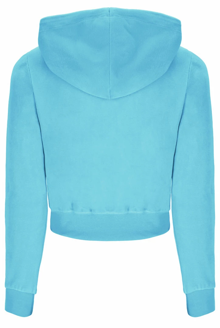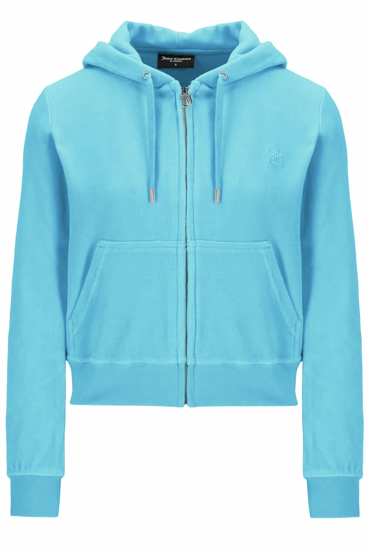 Our legendary zip through staple hoodie in petit four luxe cotton rich velour; the original Juicy Couture fabrication. Part of the Black Label collection; slim fit, with kangaroo pocket and a self-fabric lined hood, this hoodie features a statement gothic J zip pull and is branded with a tonal embroidered JC logo at the chest.
