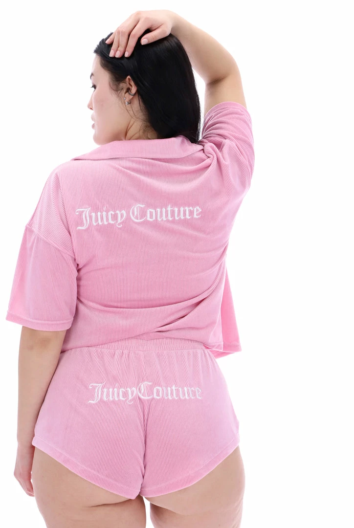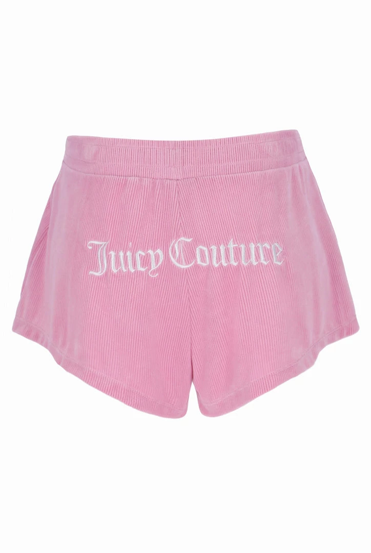 Cosy lounge shorts in lilac sachet ribbed velour. These luxe shorts feature an elastic waist with a ‘Juicy Couture’ branded patch and a high cut leg. Pair with the matching relaxed rib shirt to complete the set.