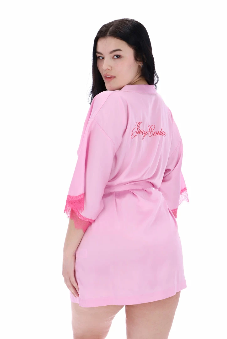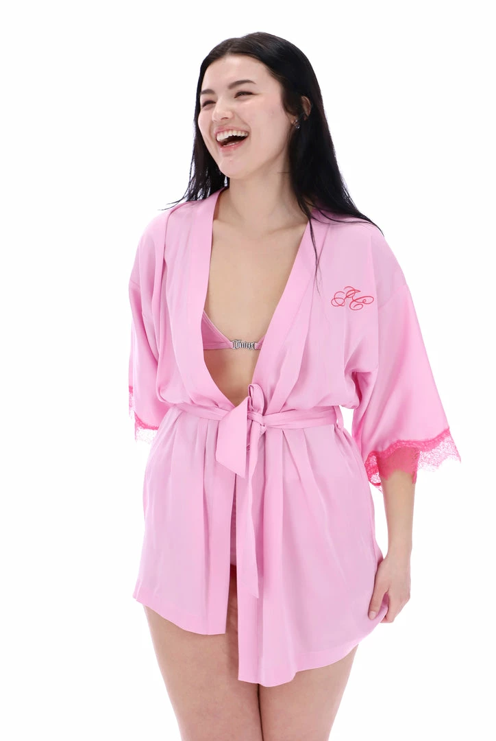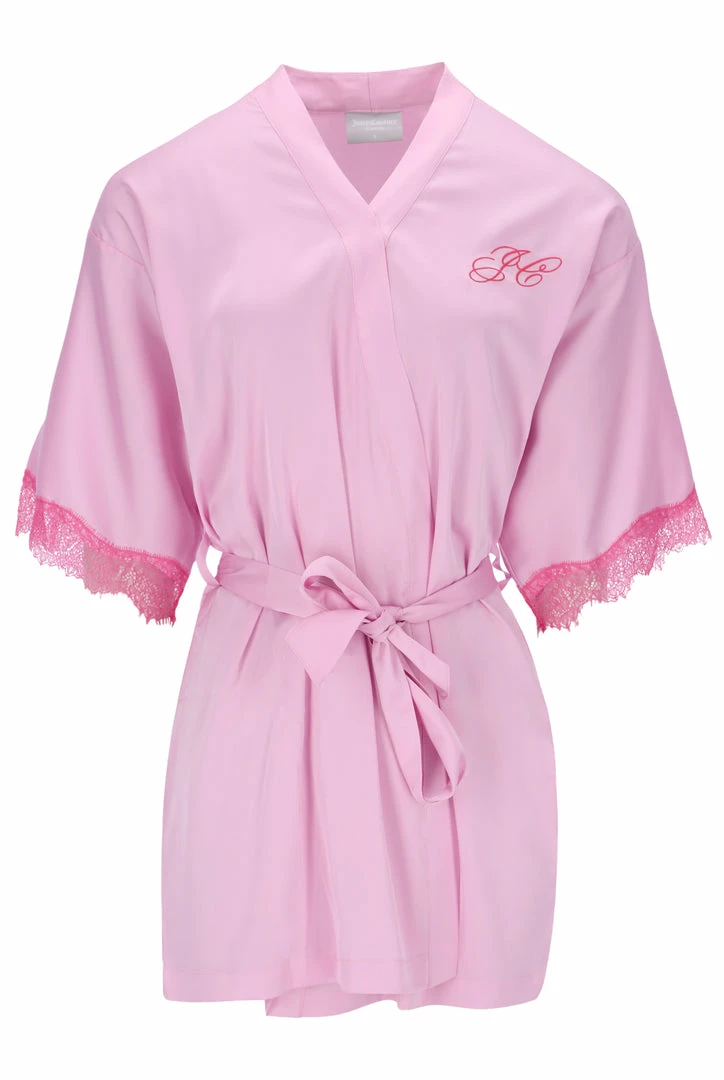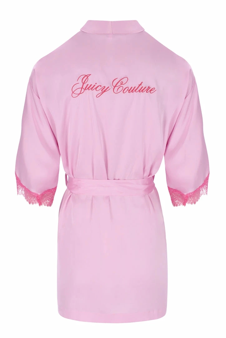 Dressing gown in lilac sachet satin. This robe features a tonal embroidered ‘JC’ logo at left chest and ‘Juicy Couture’ branding across back. A kimono silhouette with a deep V-neck, open front and a constrast lace trim. Three quarter sleeve and a belt-up fastening.