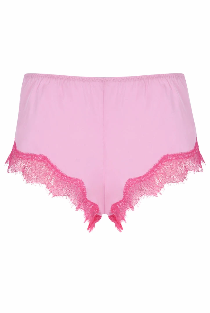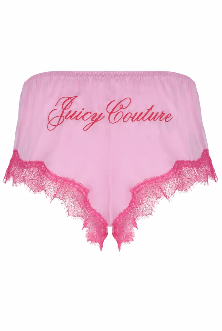 High leg short in lilac sachet. These shorts feature a stretchy elastic waist and constrast lace hem detailing. Branded with a tonal embroidered ‘Juicy Couture’ logo across back.