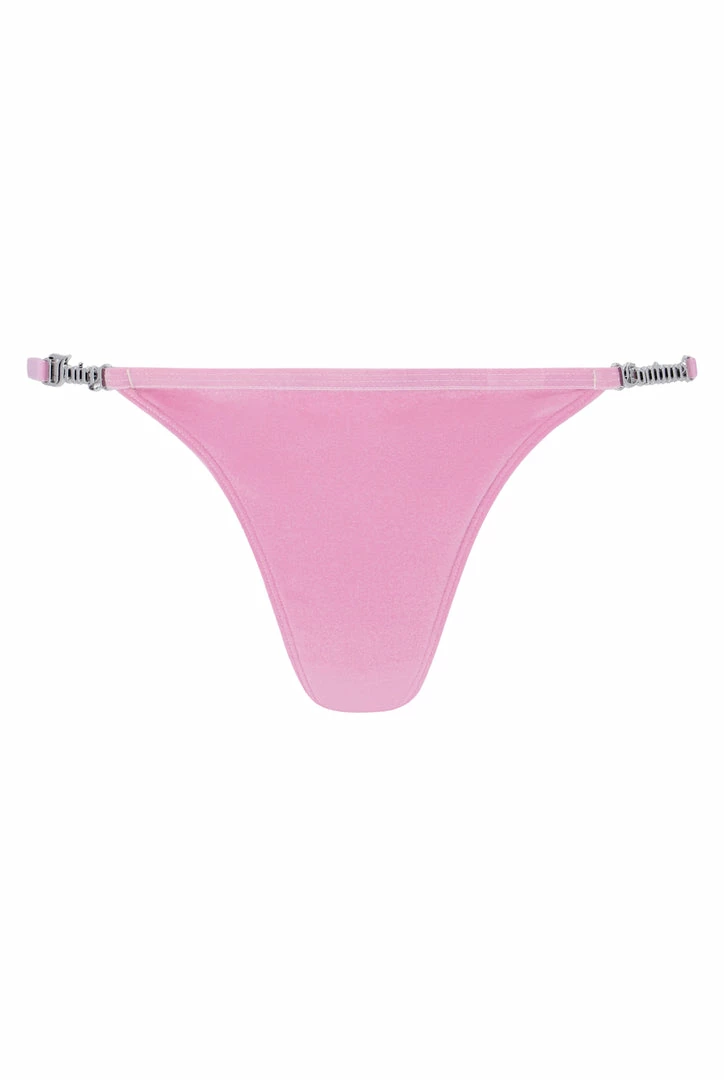 Low rise thong in lilac velvet. This classic underwear style gets a sexy update with a barely-there string feature. Sitting at the natural hip, this thong can also be worn at waist with cheeky back coverage. Branded with a silver metal ‘Juicy Couture’ at hips. Pair with the matching triangle bra for a casual flirty look.