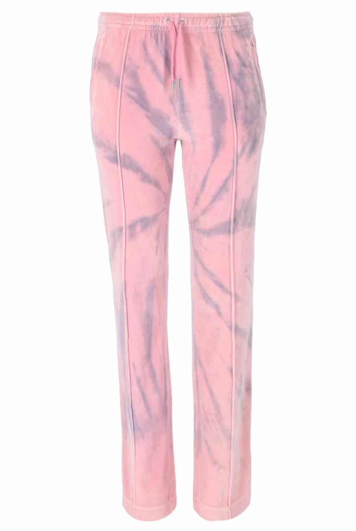 Straight leg diamante embellished tracksuit bottoms in pink tie dye cotton rich velour. Mid-rise fit, with adjustable drawstring waist and pin tucks through front leg. These bottoms feature zip pockets, statement diamante branding on the back and silver branded hardware. Pair with the matching hoodie for a full iconic Juicy Couture tracksuit.