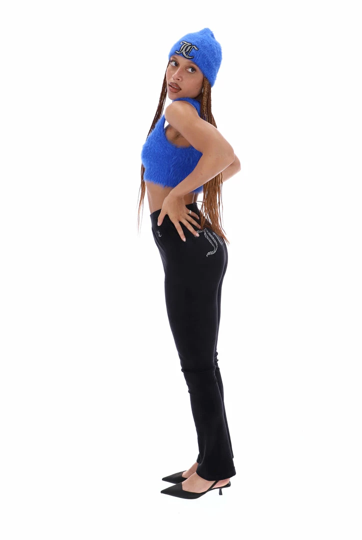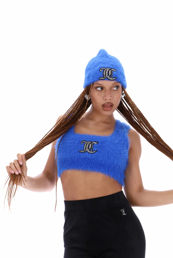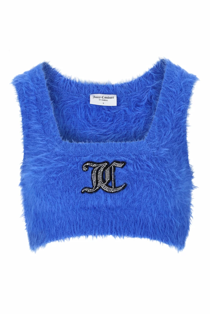 Deep square front neck crop top in blue fluffy knit. This fitted crop top is branded with a diamante ‘JC’ patch at chest.