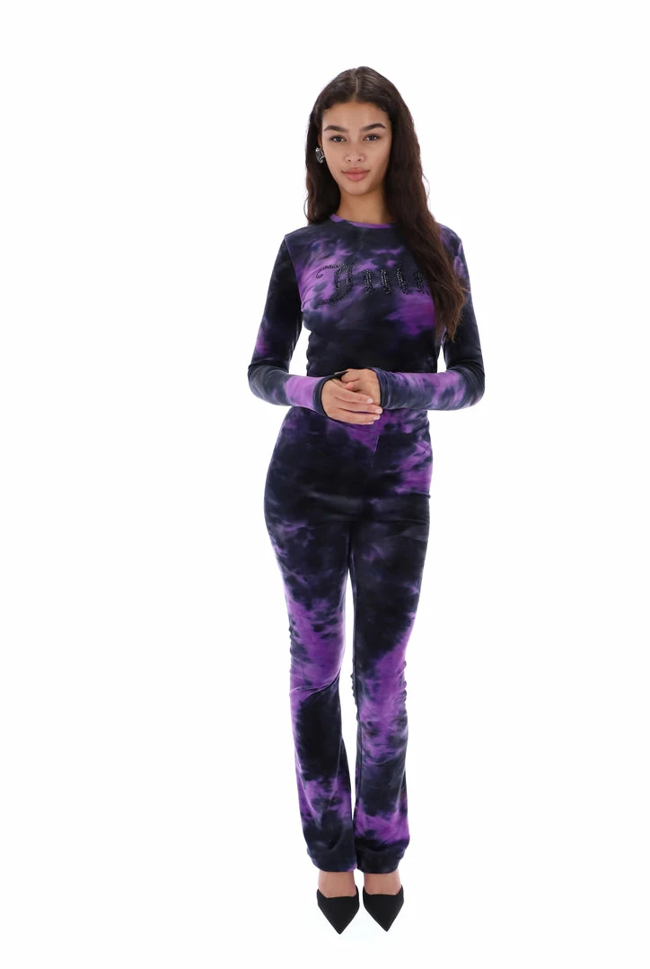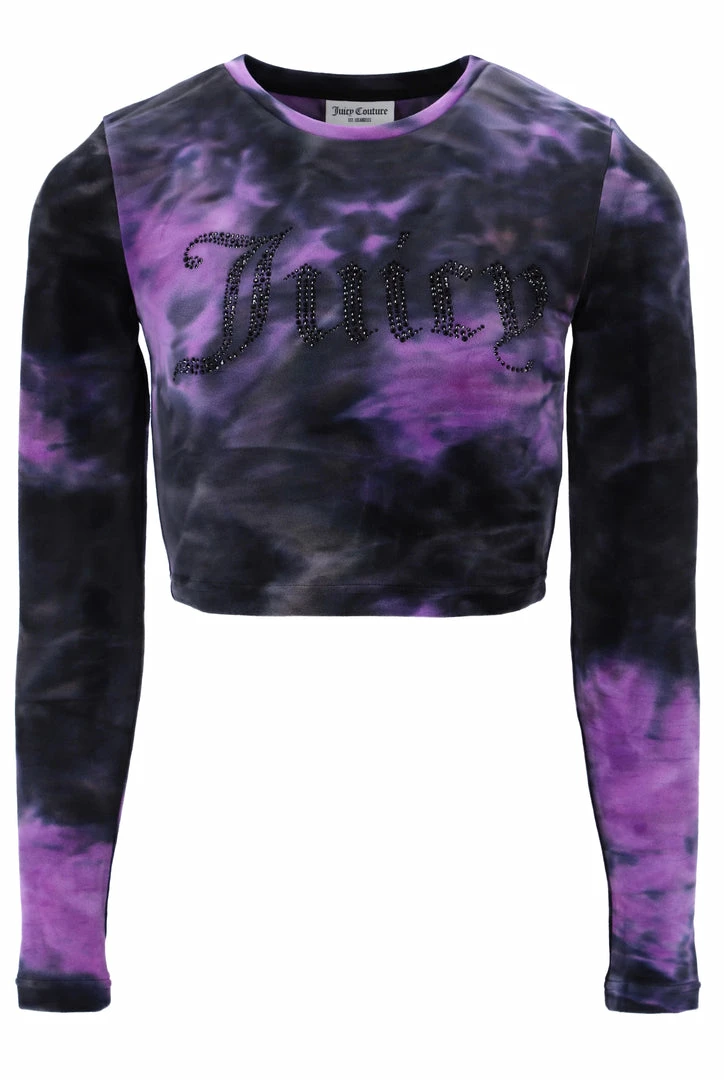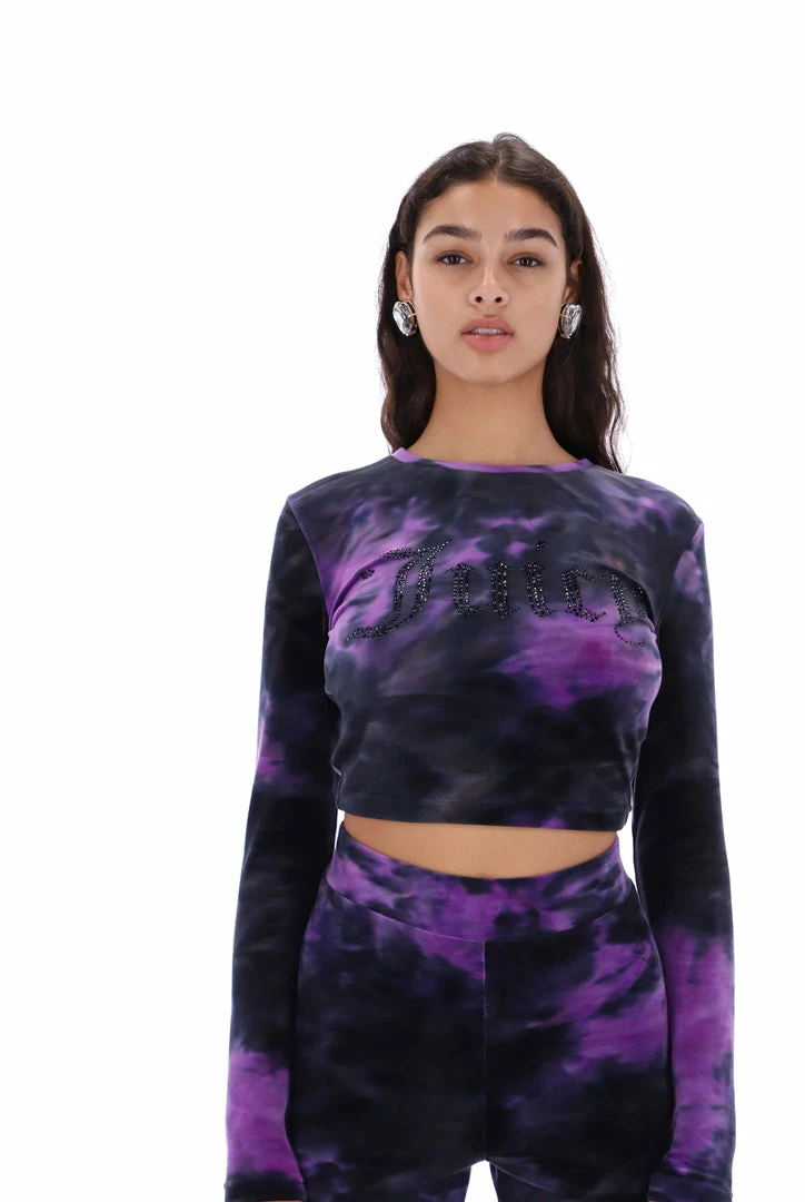 Slim fit long sleeve cropped top in purple tie dye classic velour. This crop top features an encased elastic neckline and branded with statement embellished diamante ‘Juicy’ across chest. Pair with the matching flares and track top for a complete tie dye look.