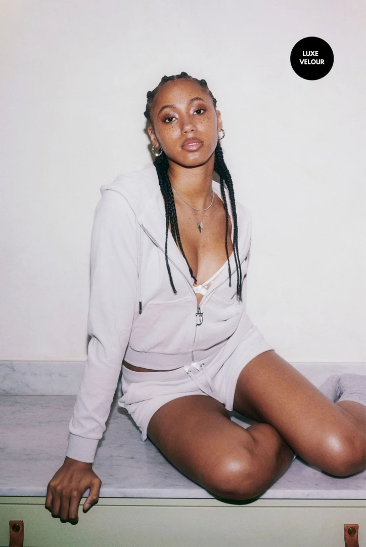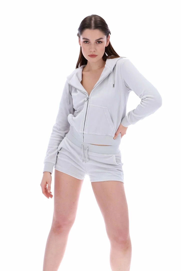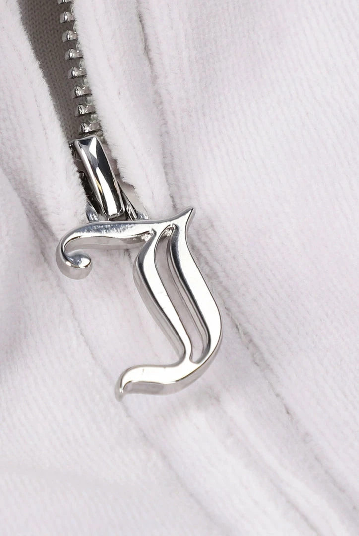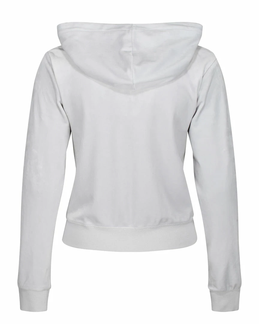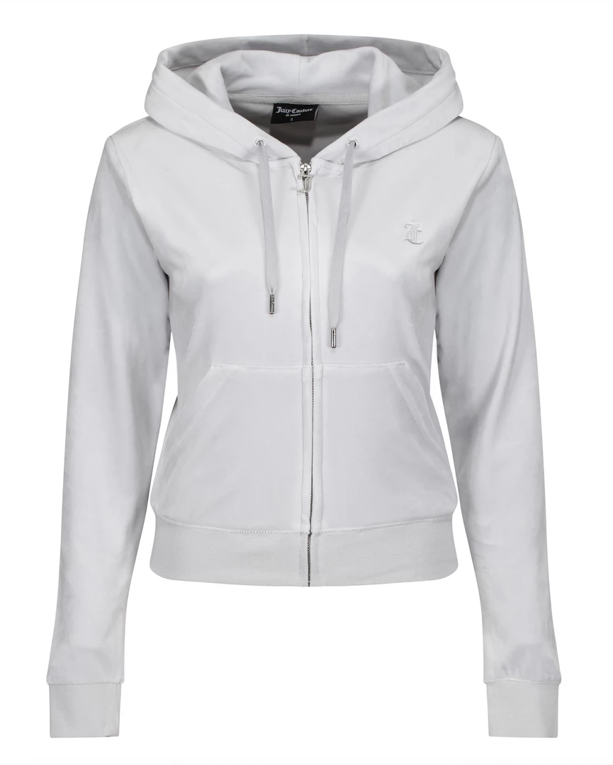Our legendary zip through staple hoodie in quiet greyย luxe cotton rich velour; the original Juicy Couture fabrication. Part of the Black Label collection; slim fit, with kangaroo pocket and a self-fabric lined hood, this hoodie features a statement gothic J zip pull and is branded with a tonal embroidered JC logo at the chest.