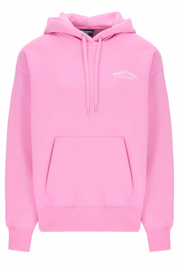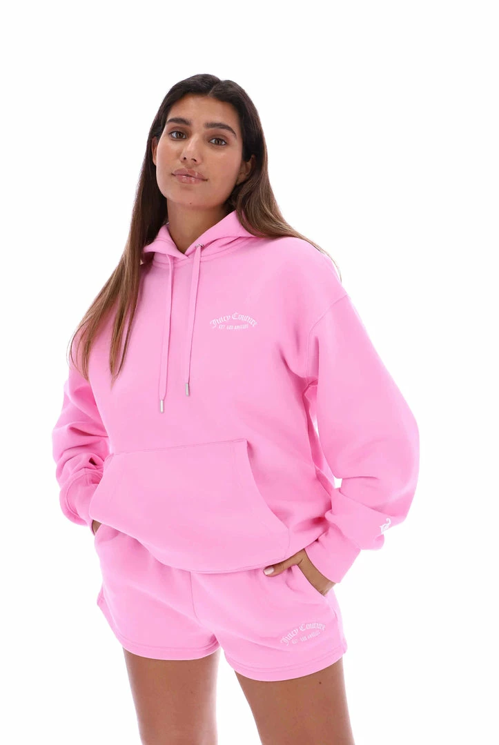 Made in Europe’- Oversized boyfriend hoodie in sachet pink recycled soft brushback fleece. This pullover hoodie features an embroidered ‘est Los Angeles’ JC branding at chest, a kangaroo front pocket and branded silver hardware. Pair with the matching joggers or shorts to complete the look.