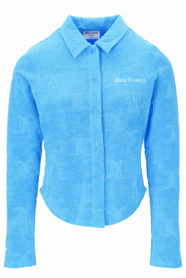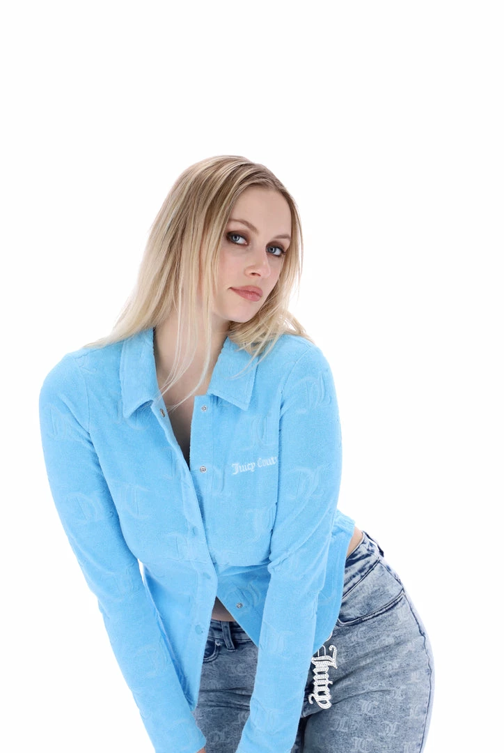 Long sleeve monogram jacquard shirt in aqua recycled terry towelling. This fitted collared button down shirt features a rounded hem and is branded with an all over monogram jacquard ‘JC’ logo. Pair with the matching trousers to complete the look.