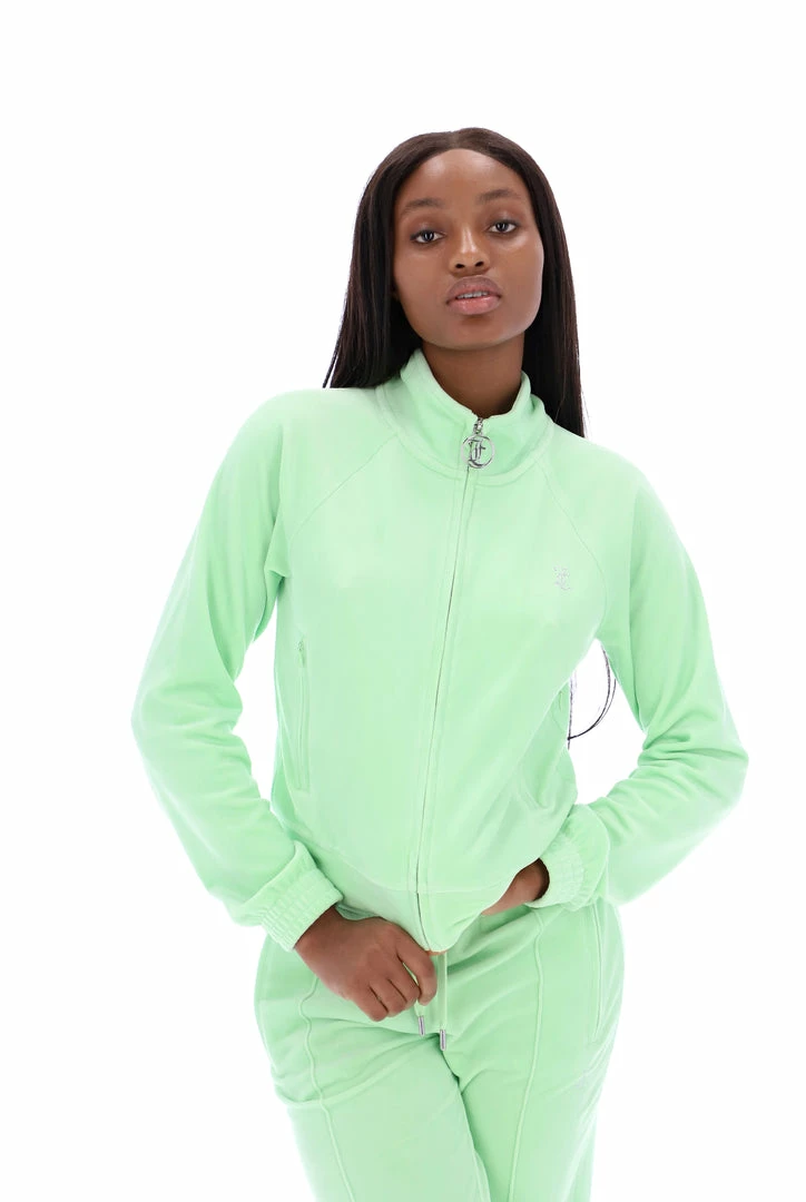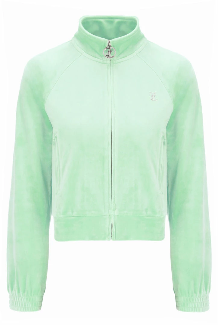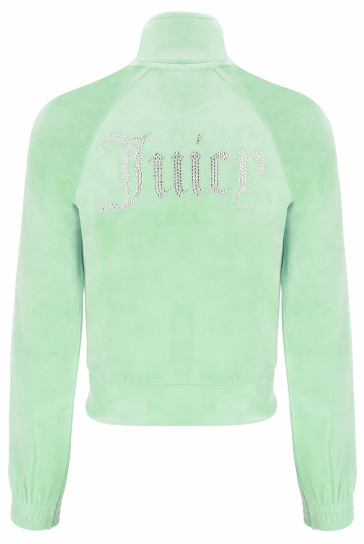 Diamante embellished track top in mint classic velour. Slim fit zip-through style with a high neck, zipped pockets, smocked cuffs and a statement diamante logo branding on the back. This track top is finished with a silver branded round zip pull. Pair with the matching bottoms for a full iconic Juicy Couture tracksuit.