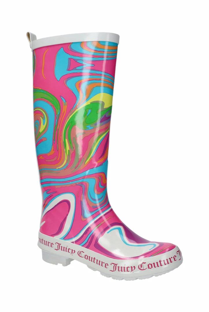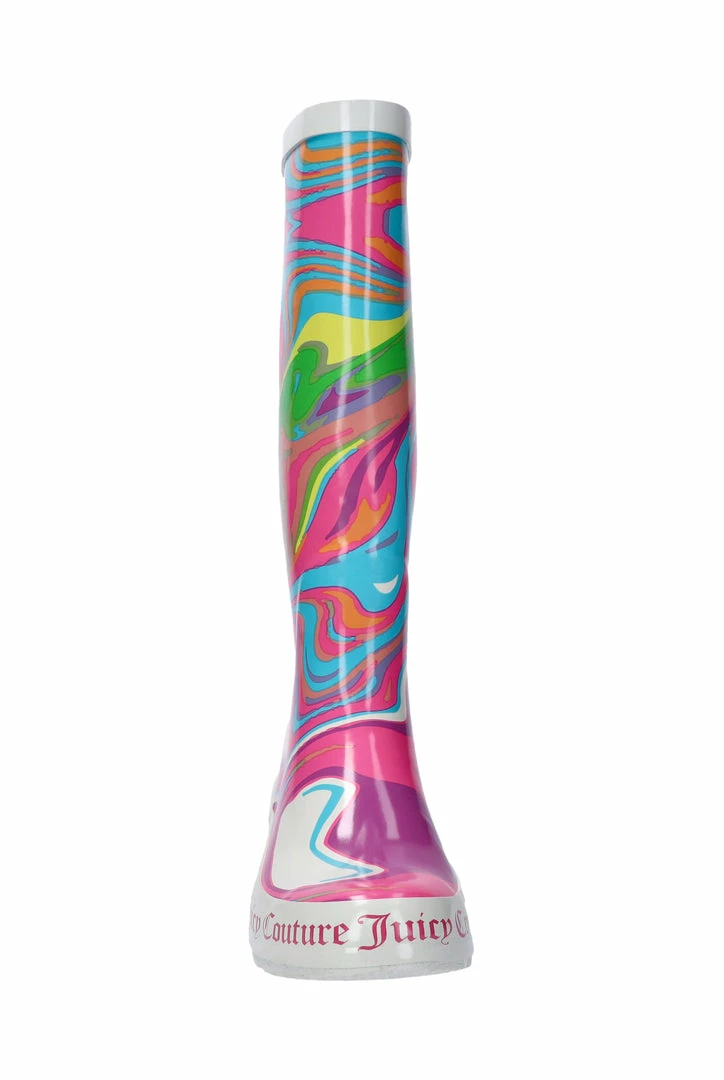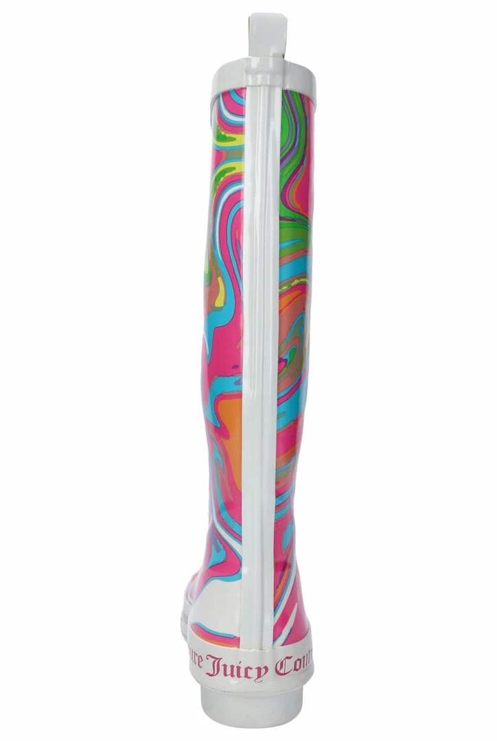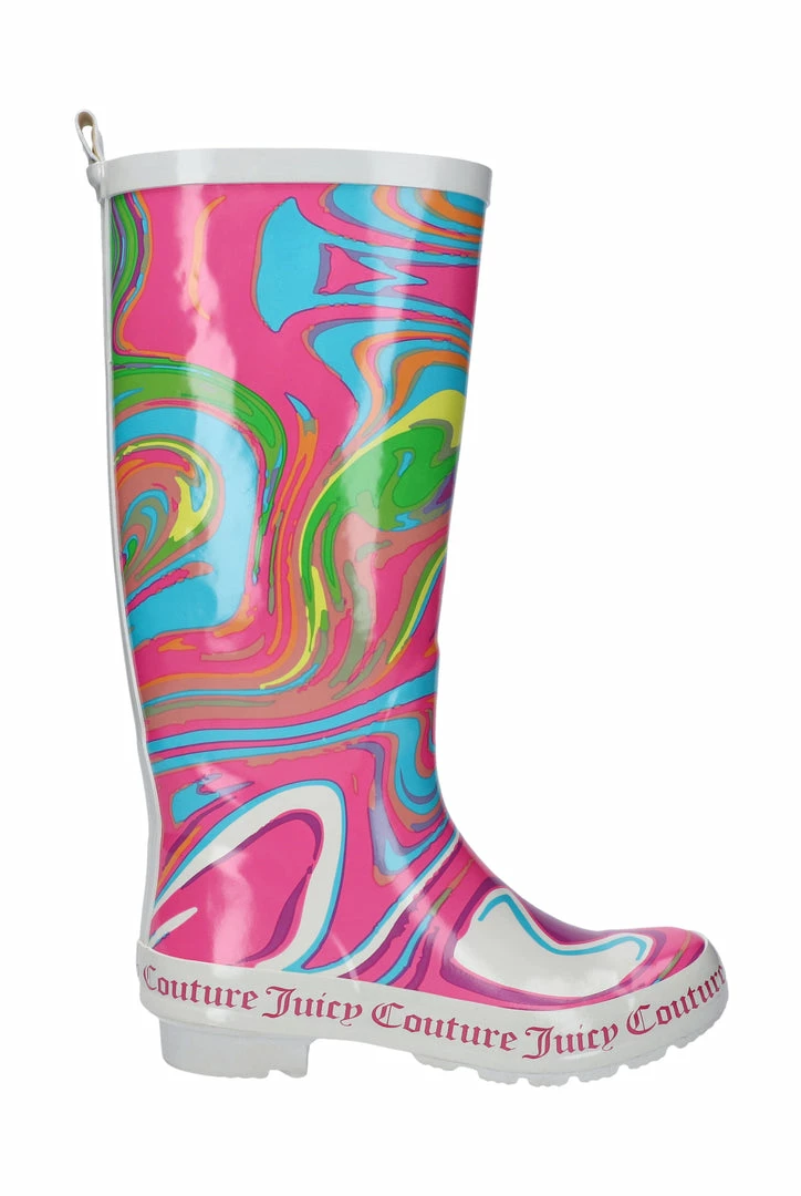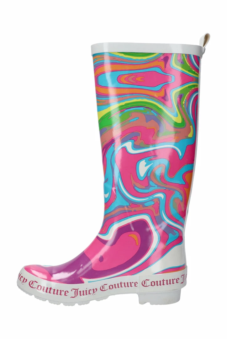 Rainbow swirl wellington boots with Juicy Couture branding. These boots feature a soft cotton lining for comfort.