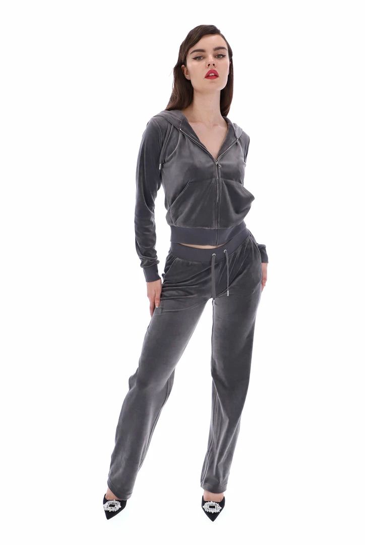 Mid-rise plain tracksuit bottoms in top hat classic velour. Straight leg fit, with adjustable drawstring ribbed waist and front angled pockets. These core joggers are branded with silver hardware and a tonal embroidered JC logo at the hip.