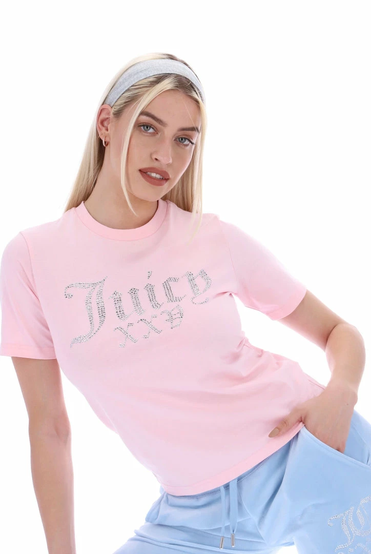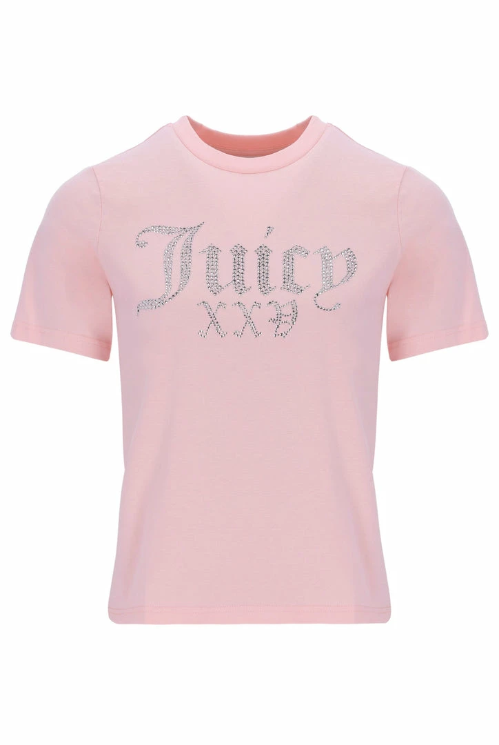 Celebrating 25 years of our iconic tracksuit; almond blossom short sleeve numeral diamante girlfriend tee. This crew neck is branded with a diamante ‘Juicy 25’ roman numeral graphic across chest.