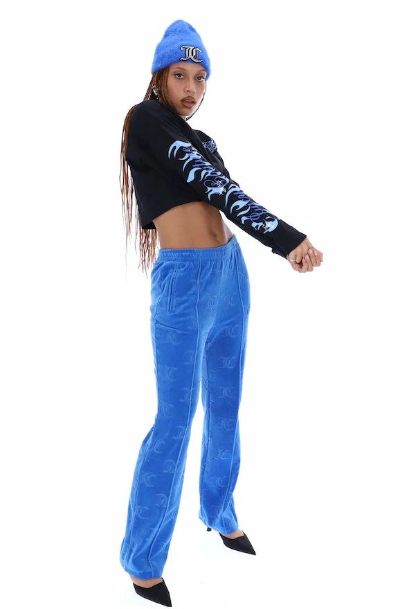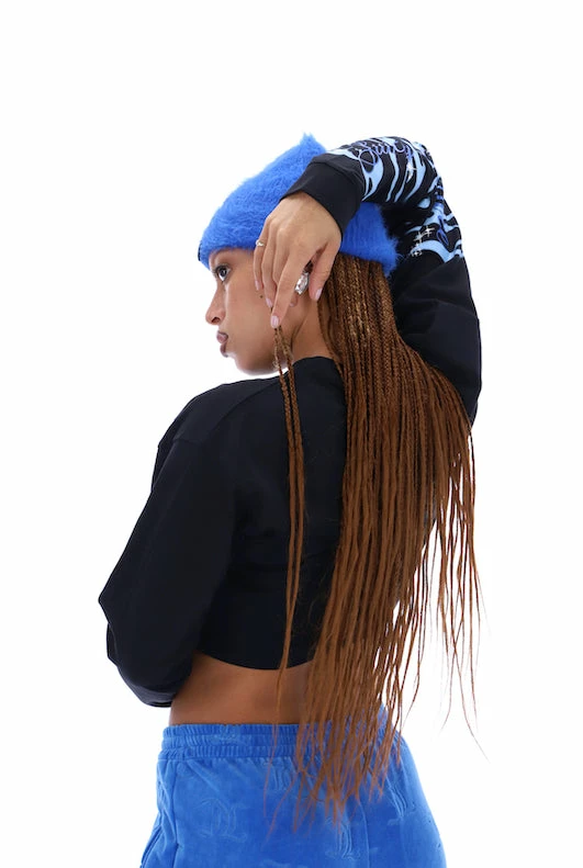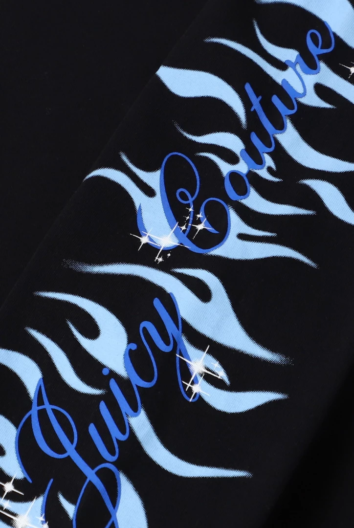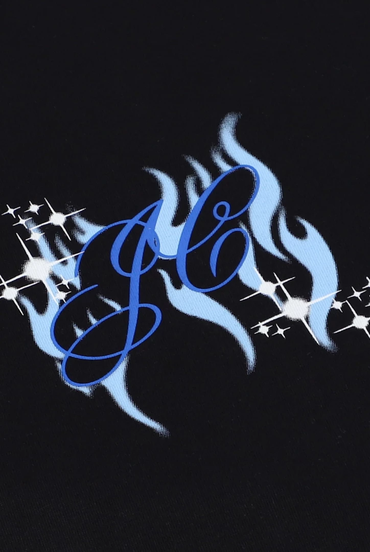 Long sleeve cropped t-shirt in black cotton. This boyfriend fit tee features a flame printed branded graphic down the arm and at left chest. Complete the set with the matching pullover hoodie and boyfriend joggers.