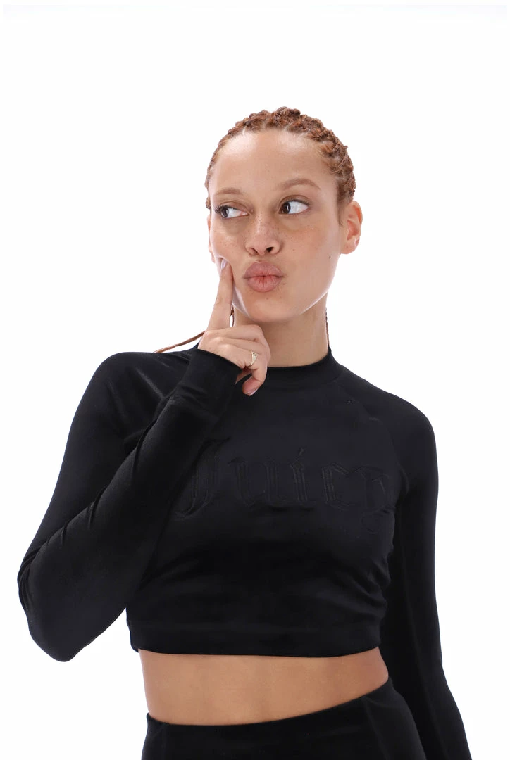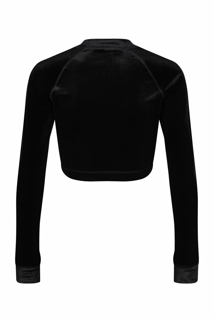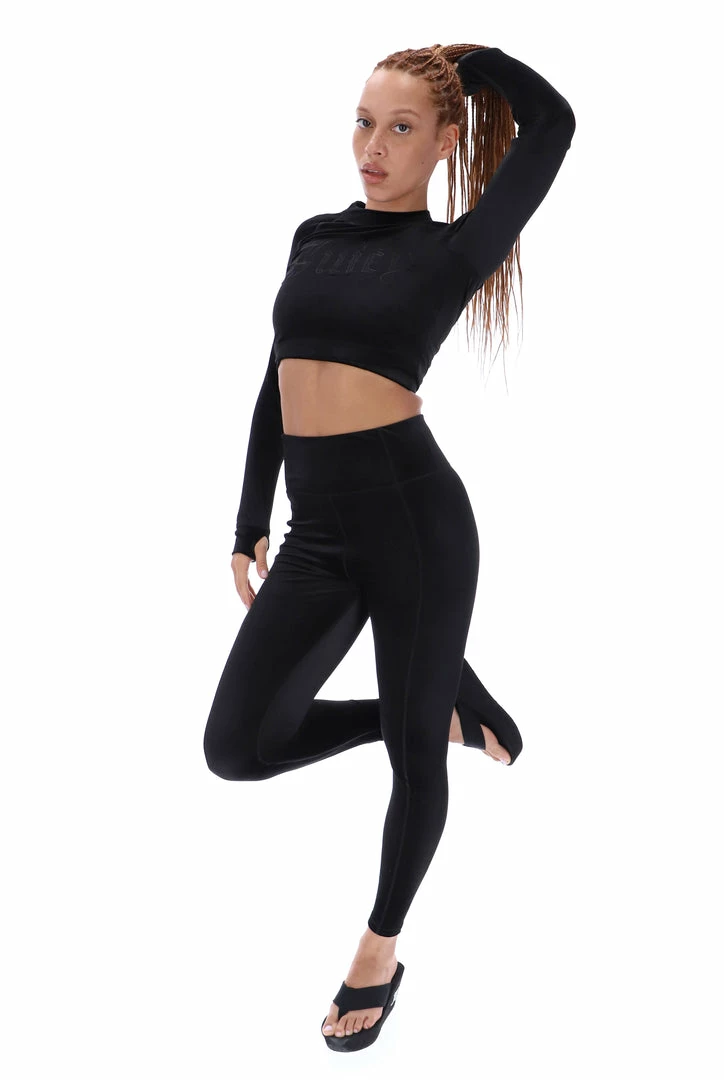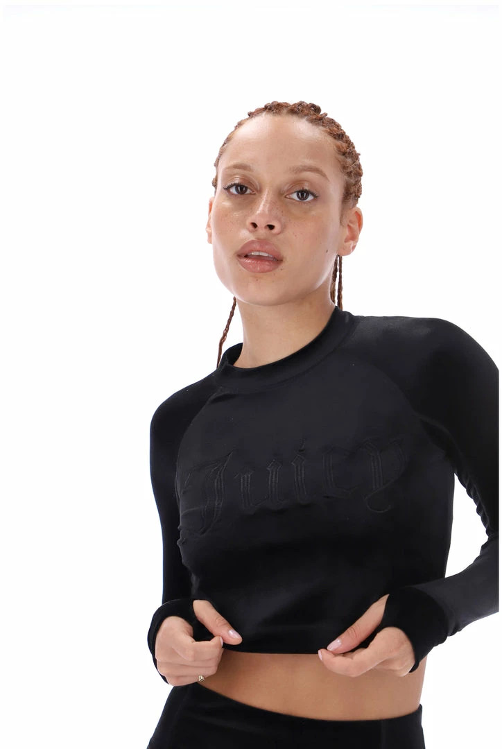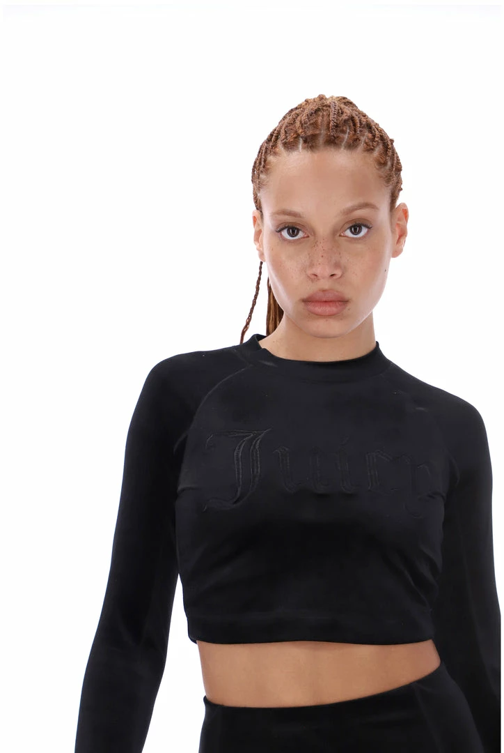 Cropped fit long sleeve tee in black velvet jersey. This tee is branded with an embroidered ‘Juicy Couture’ logo through chest. Pair with the Matching high waisted leggings for a full velvet yoga inspired fit.