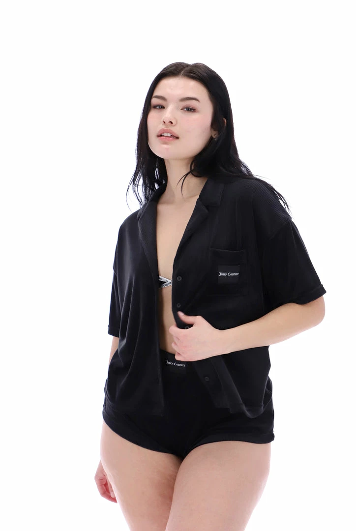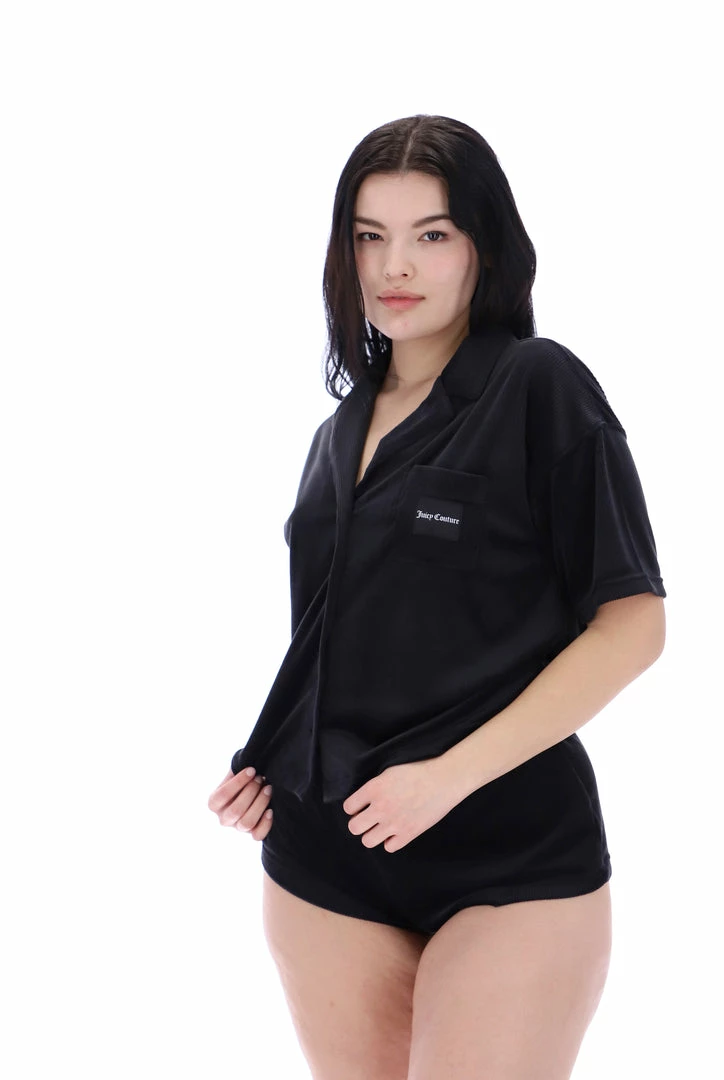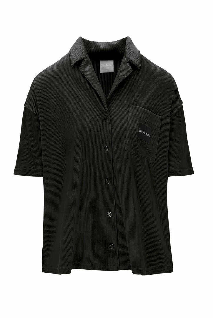 Short sleeve shirt in black soft rib velour. This relaxed fit shirt features a classic collar, button closures along the front and a branded patch pocket at left chest. Branded with an embroidered ‘Juicy Couture’ logo across back. Pair with the matching rib velour shorts for a full luxurious loungewear look.