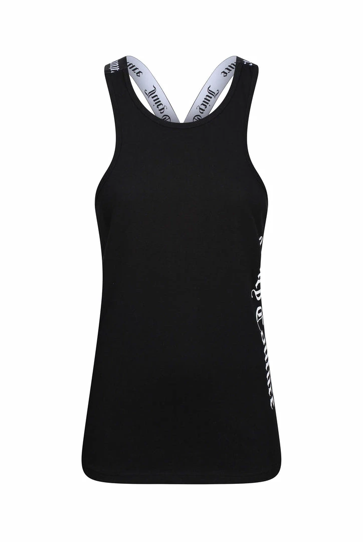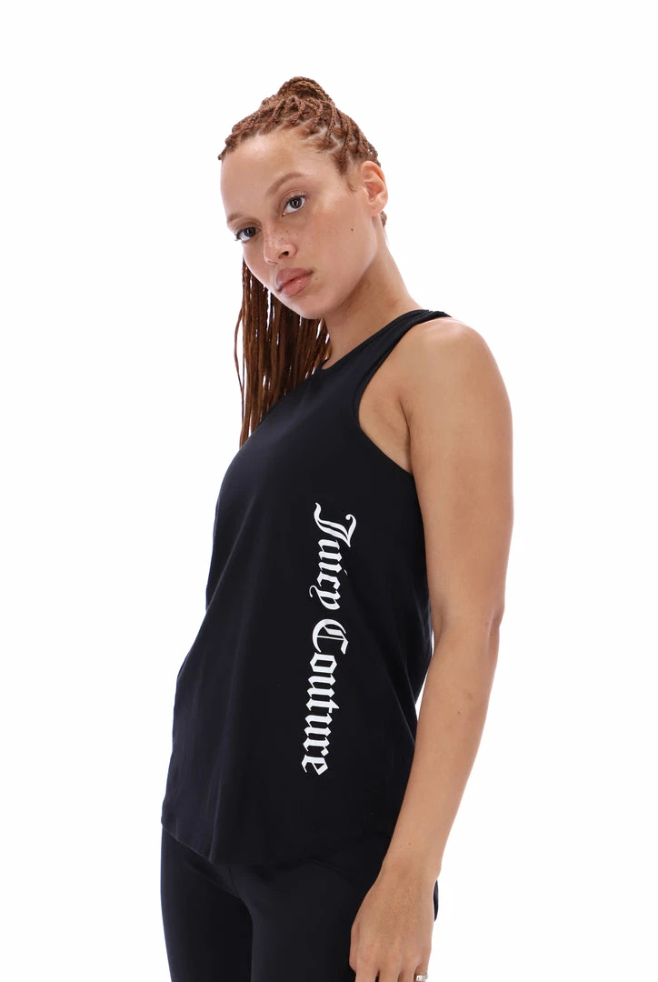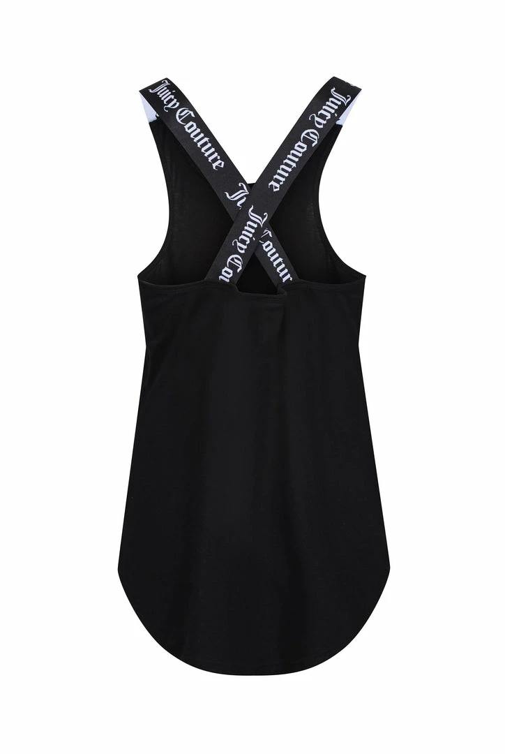 Loose fit tank top in black single jersey. This tank top features a jacquard elastic racer front, a scoop neck and t-bar back, making it the perfect layering piece. Branded with our gothic monochrome ‘Juicy Couture’ logo.