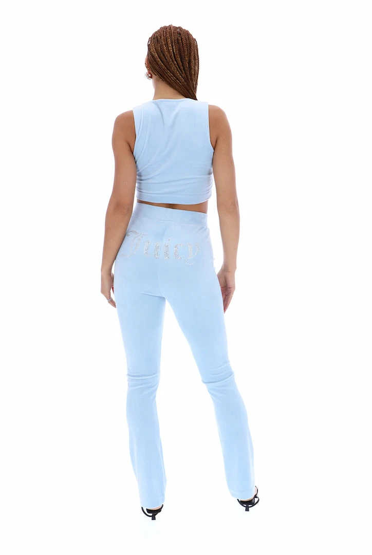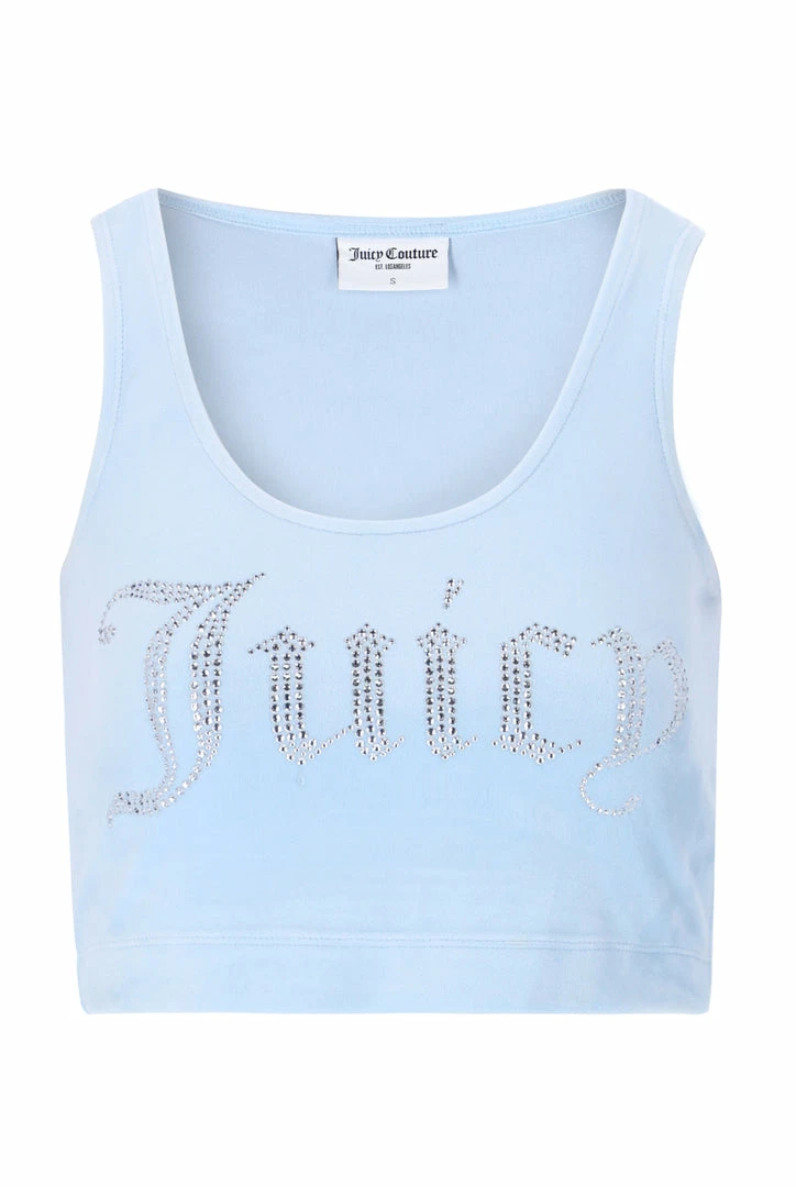 Velour square neck crop in cool blue. This crop top is branded with Juicy diamante embellishment across chest.