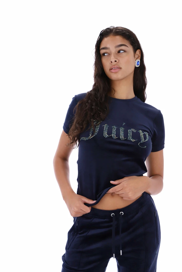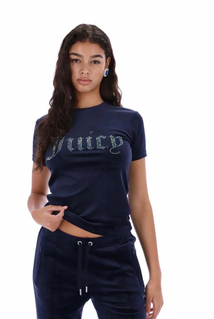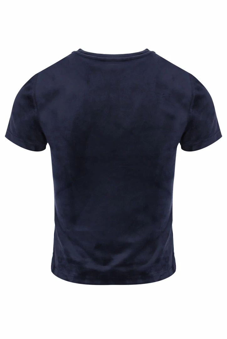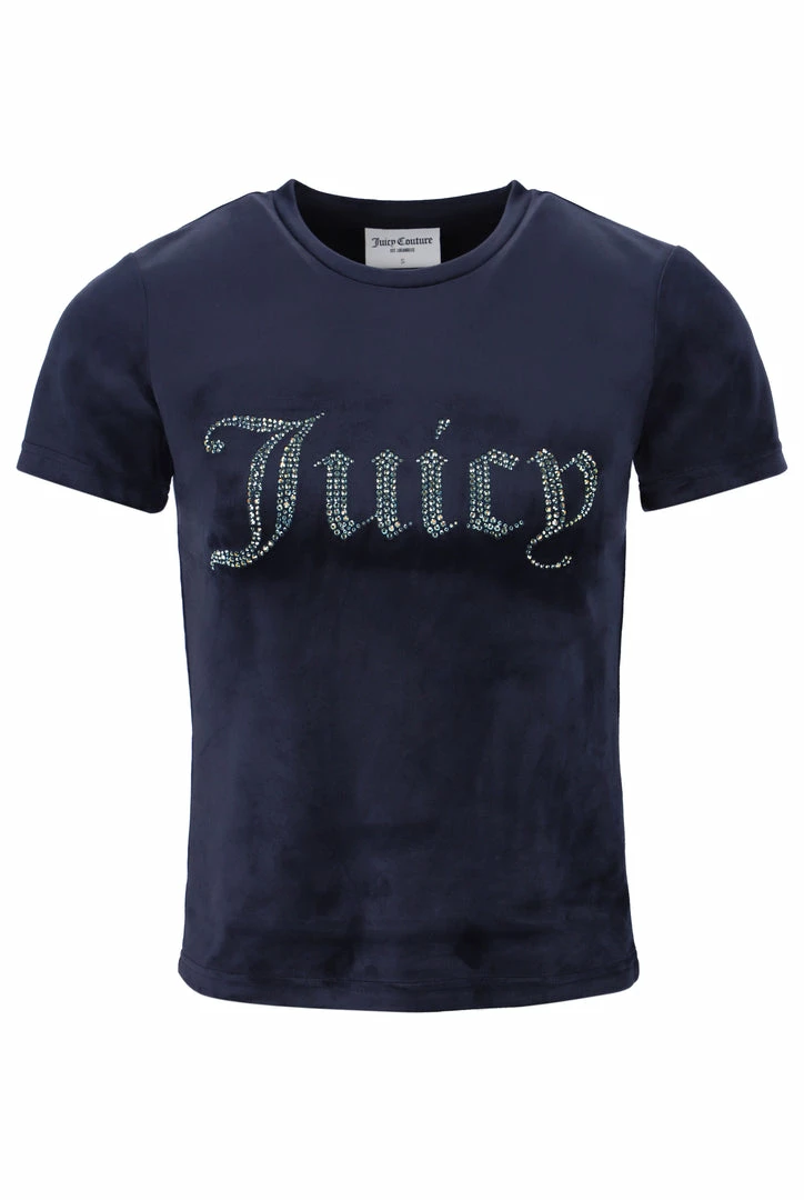 Fitted velour short sleeve t-shirt in navy blue night sky. This crew neck t-shirt is branded with Juicy diamante embellishment across chest and finished with rib binding at neck.