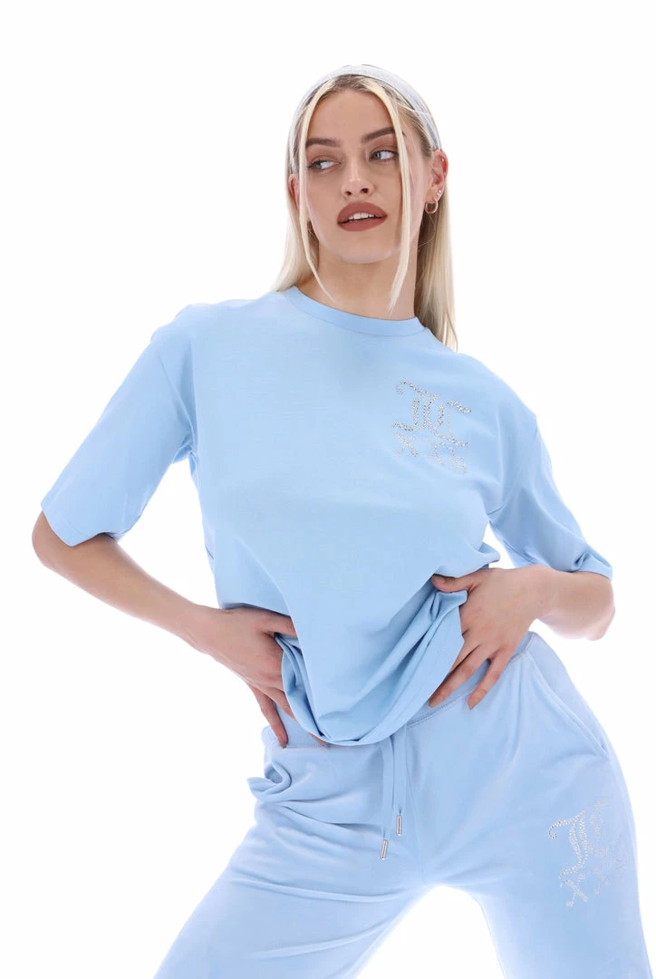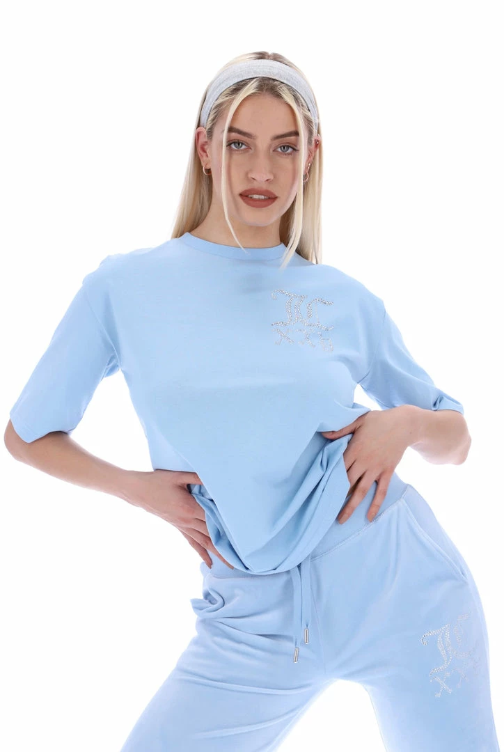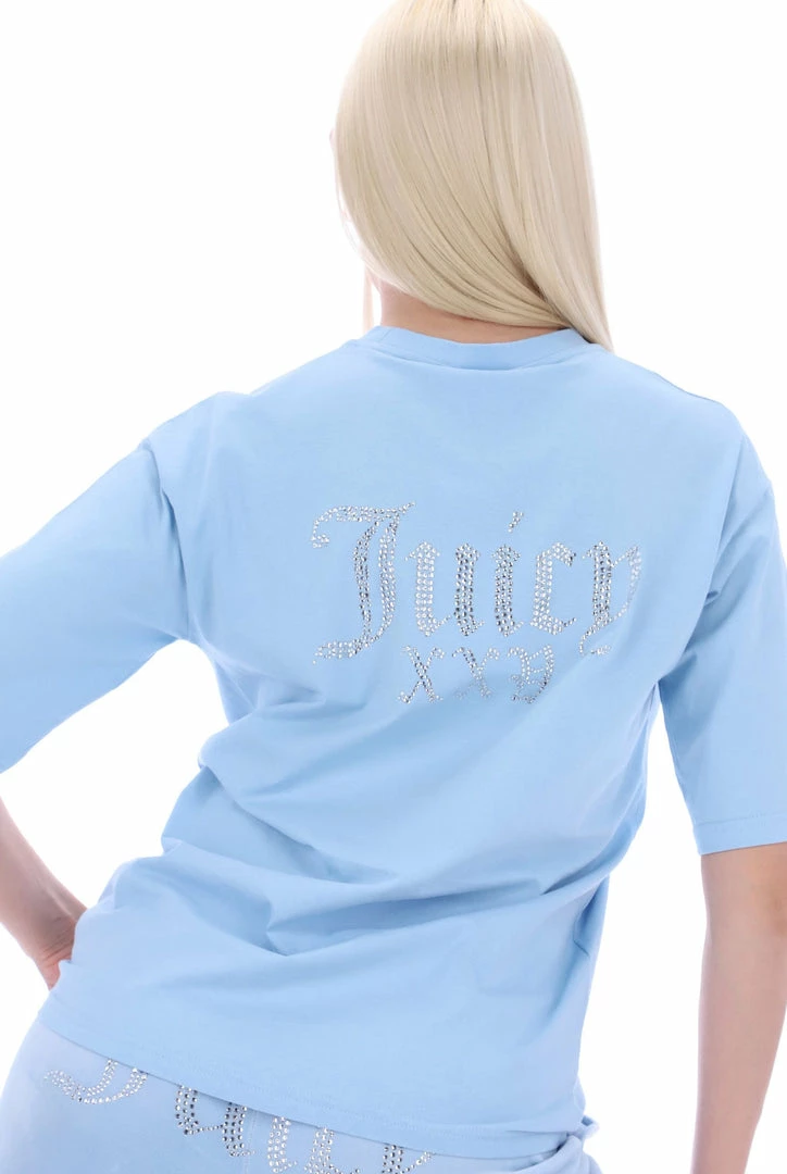 Celebrating 25 years of our iconic tracksuit; powder blue short sleeve numeral diamante unisex tee. This crew neck is branded with a diamante ‘JC 25’roman numeral graphic across chest and ‘Juicy 25’ on back.