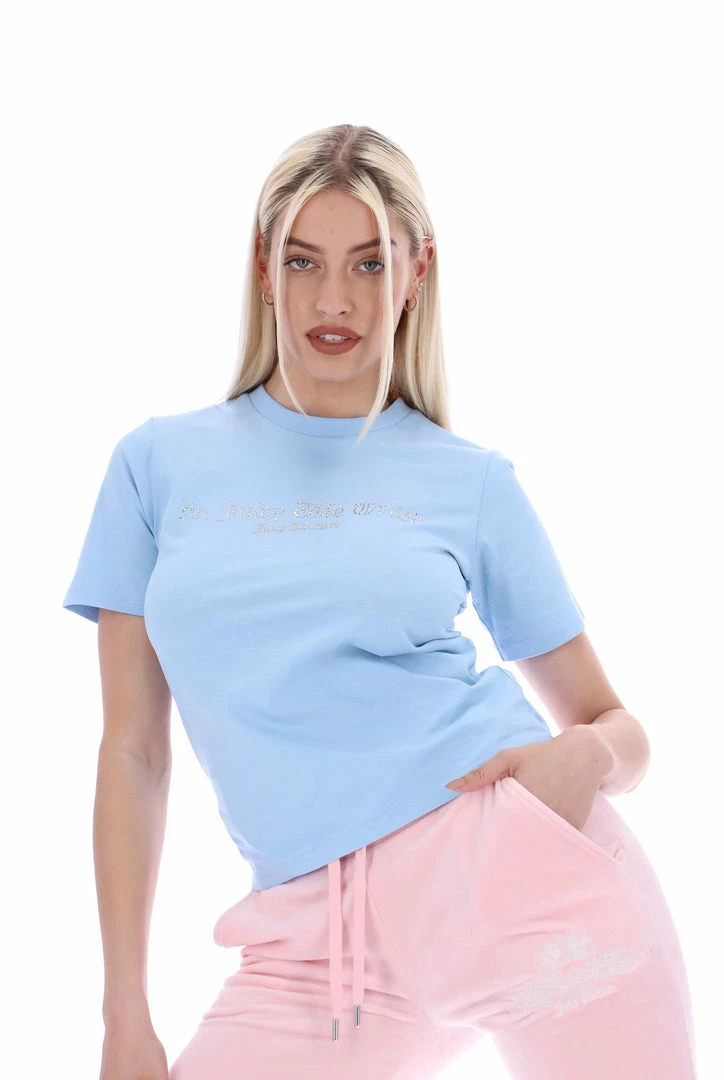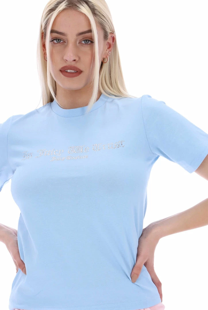 Celebrating 25 years of our iconic tracksuit; powder blue short sleeve graphic girlfriend tee. This crew neck is branded with an ‘In Juicy We Trust’ graphic across chest.