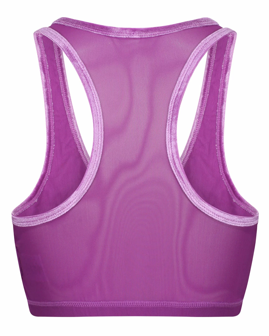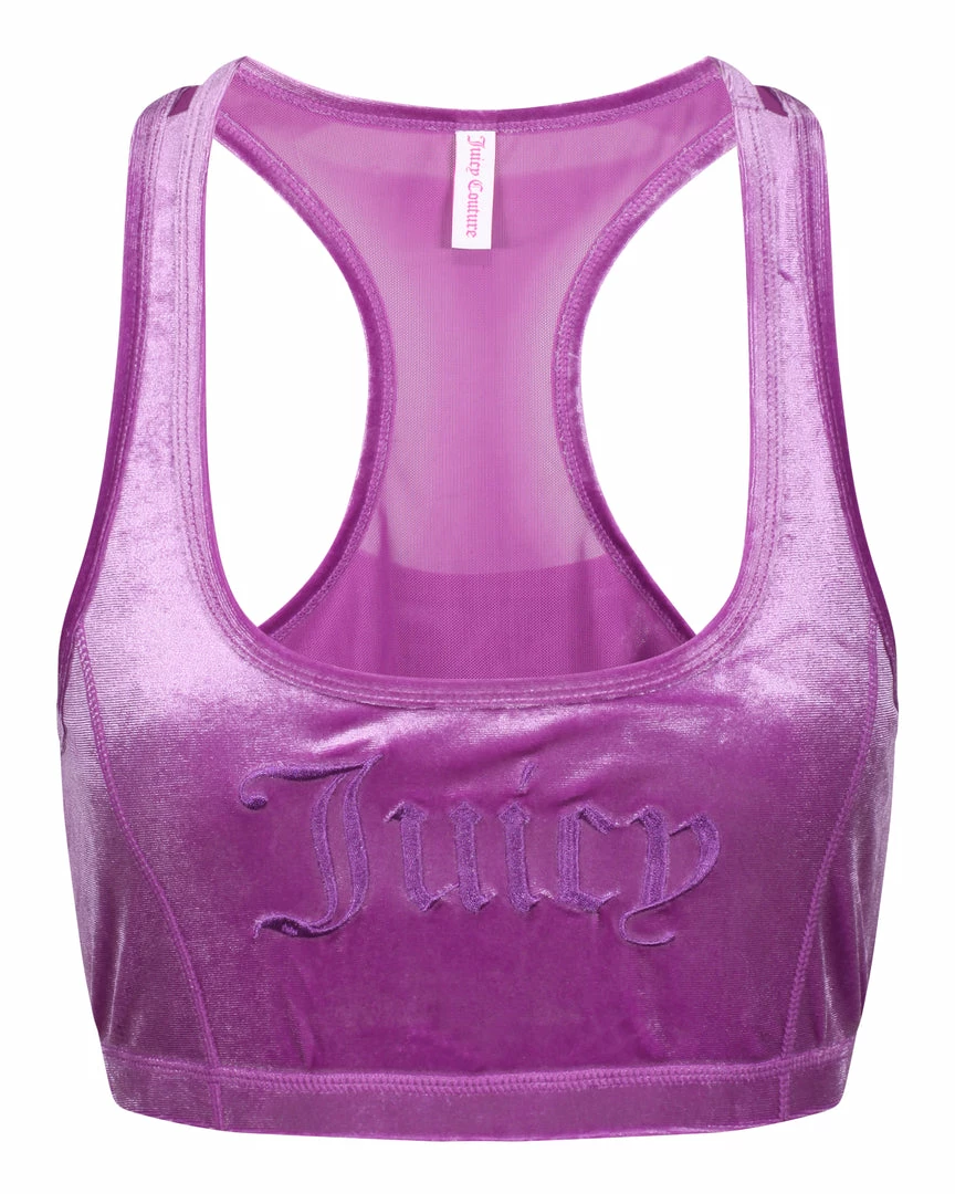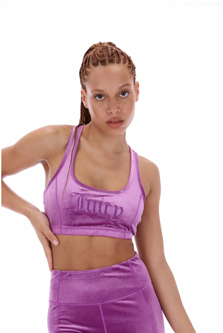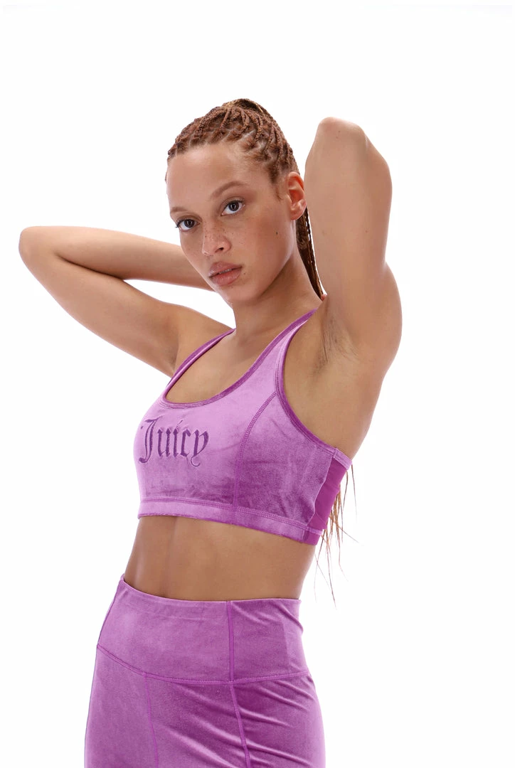 Low impact racer bra in sparkling grape velvet. This bra features a rib panel through hem with a soft sculpting and bust shaping seam. Tonal flatlock stitch princess seams for a sculpted fit. Featuring a power mesh racer panel through back and is branded with an embroidered Juicy through chest. Pair with the matching leggings for a full velvet yoga inspired fit.