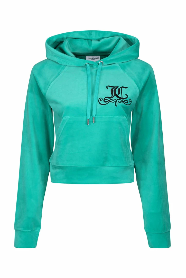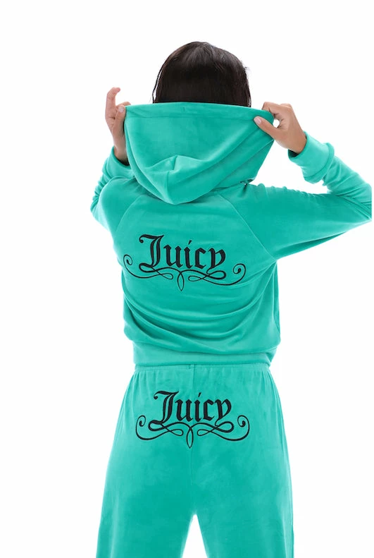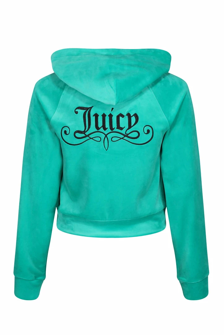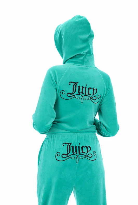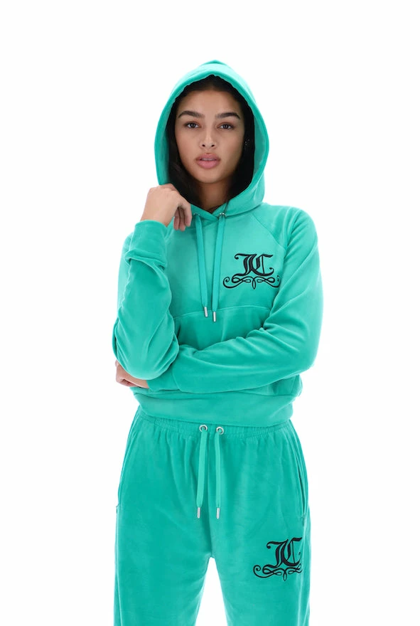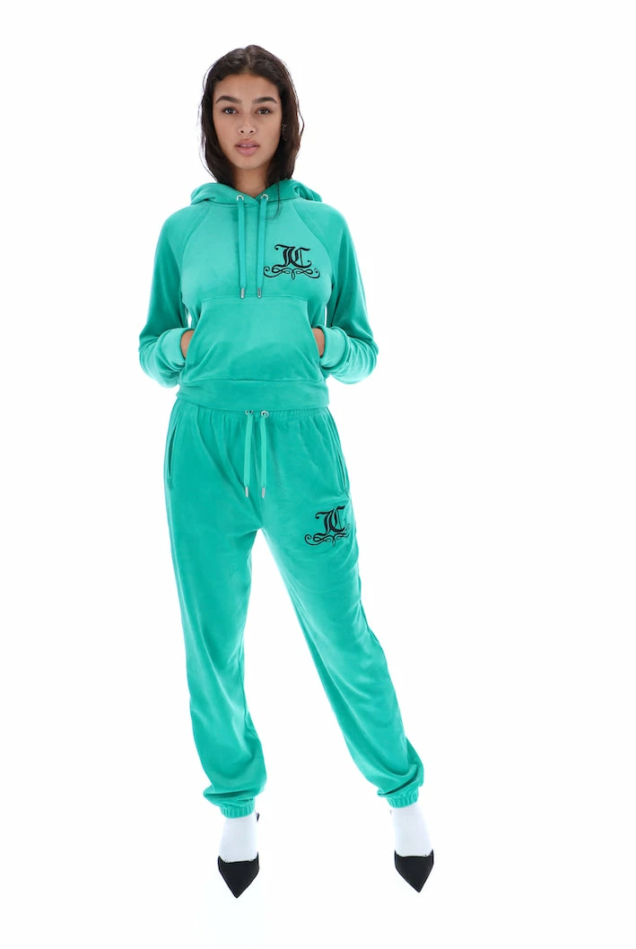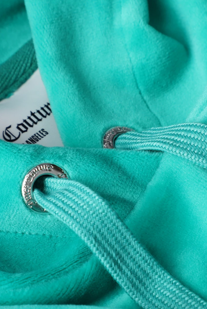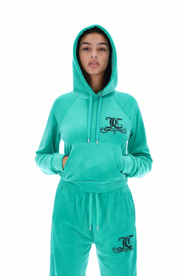 Slim-fit embroidered hoodie in dynasty green classic velour. This pullover hoodie features a front kangaroo pocket, statement JC crest emboirdery at chest and Juicy branding at back and is finished with silver branded hardware. Pair with the matching bottoms for a full iconic Juicy Couture tracksuit.