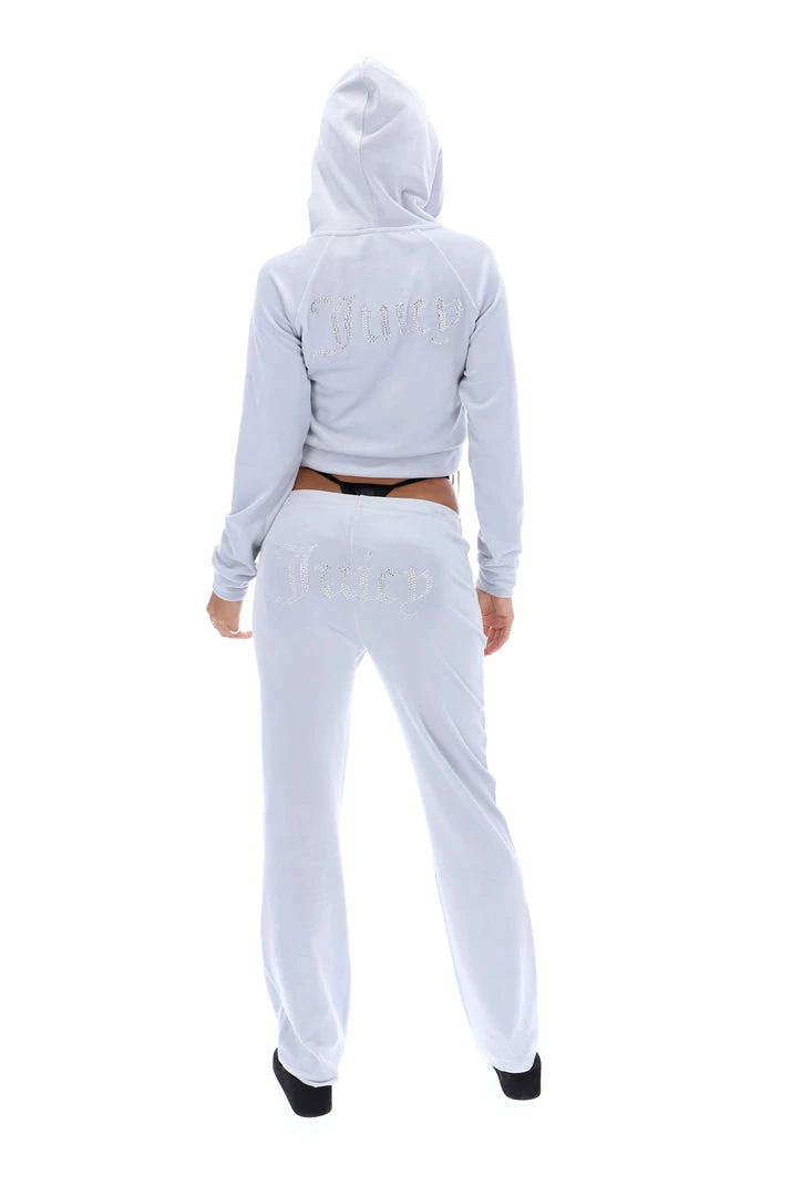 Slim-fit diamante embellished hoodie in quite grey classic velour. This pullover hoodie features a front kangaroo pocket, statement diamante branding at back and is finished with silver branded hardware. Pair with the matching bottoms for a full iconic Juicy Couture tracksuit.