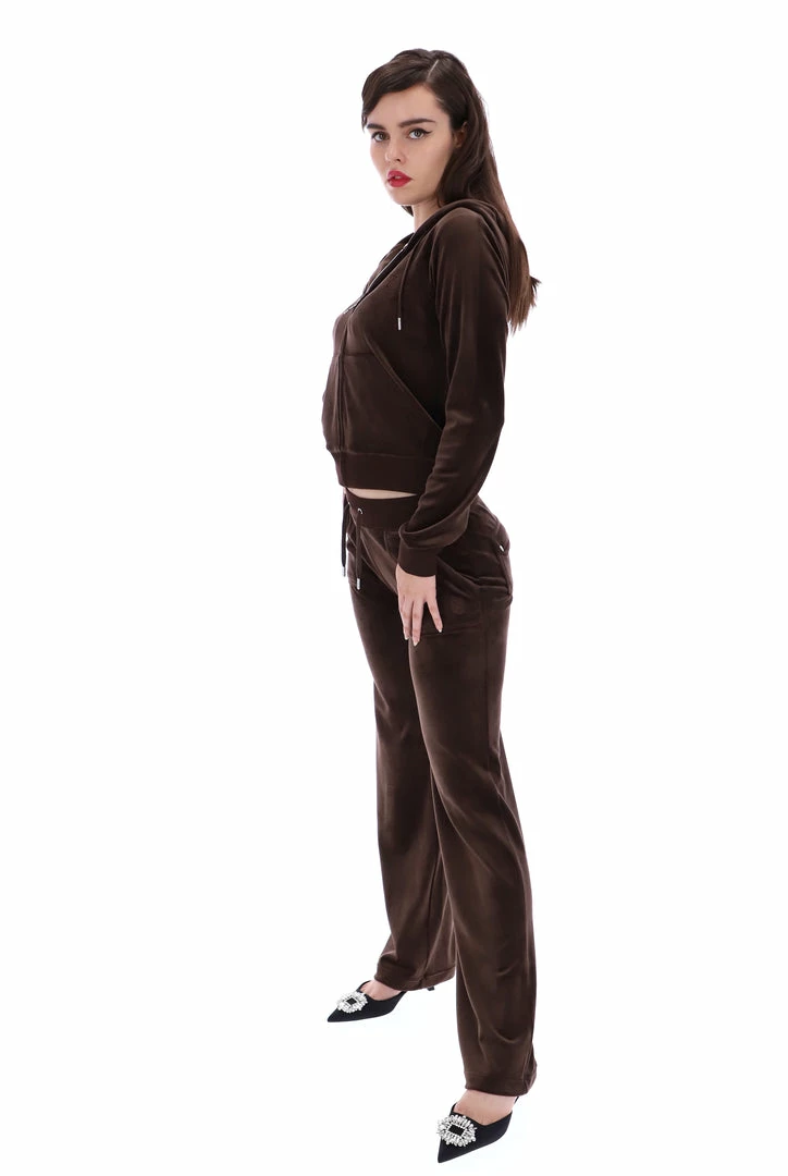 Mid-rise plain tracksuit bottoms in java brown classic velour. Flared leg fit, with adjustable drawstring ribbed waist and front feature patch pockets. These Black Label joggers feature back popper fastening pockets, silver branded hardware and are finished with a tonal embroidered JC logo at the hip. Pair with the Robertson hoodie for the full iconic tracksuit staple.