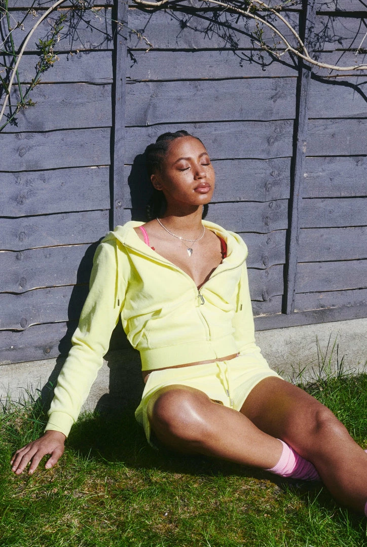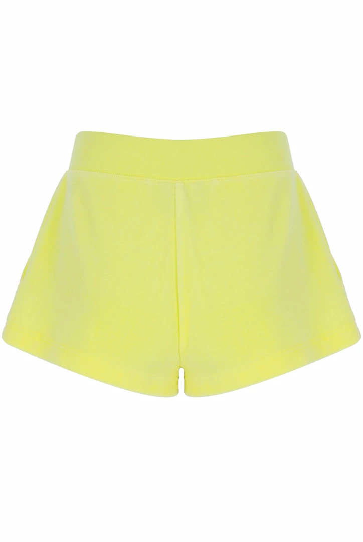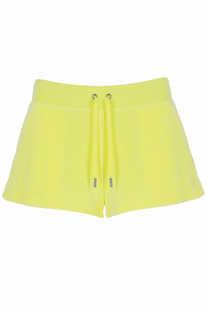 Mid-rise plain shorts in lemon drop cotton rich luxe velour; the original Juicy Couture fabrication. Part of the Black Label collection; a short flirty fit, with adjustable drawstring ribbed waist and front angled pockets. These iconic core track shorts are branded with silver hardware and a tonal embroidered JC logo at the hip.