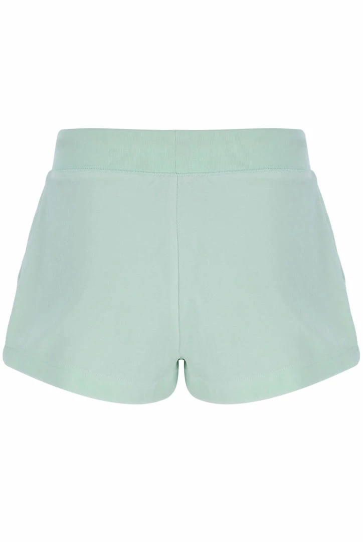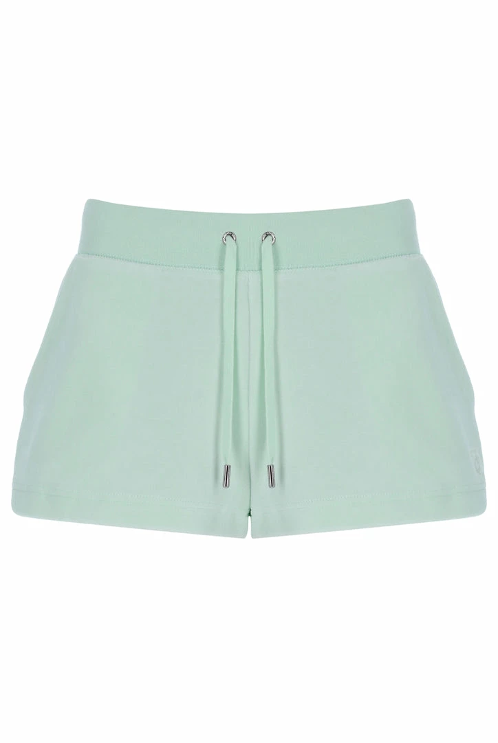 Mid-rise plain shorts in mint cotton rich luxe velour; the original Juicy Couture fabrication. Part of the Black Label collection; a short flirty fit, with adjustable drawstring ribbed waist and front angled pockets. These iconic core track shorts are branded with silver hardware and a tonal embroidered JC logo at the hip.