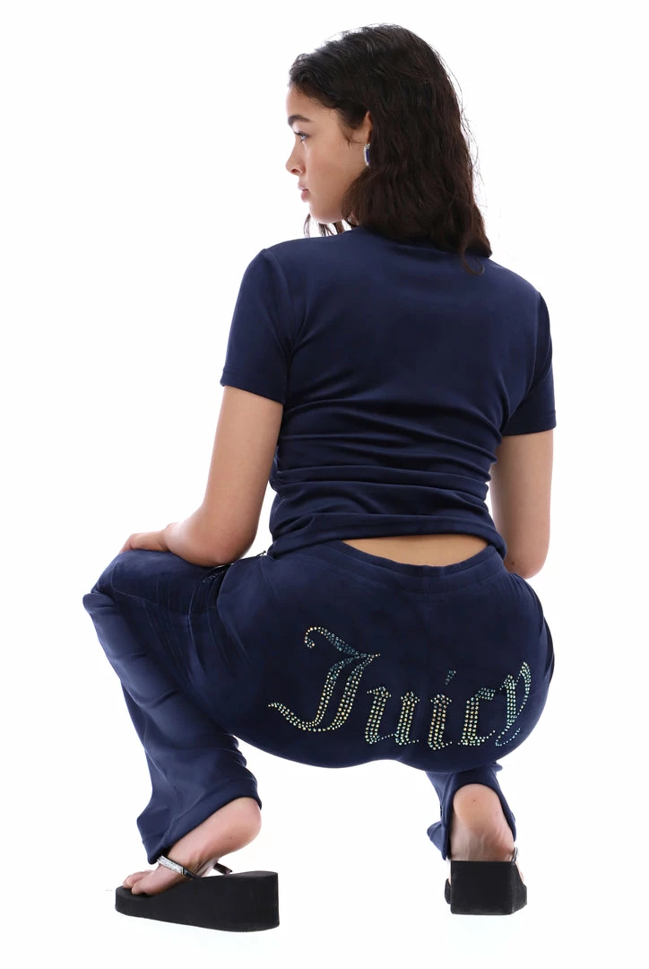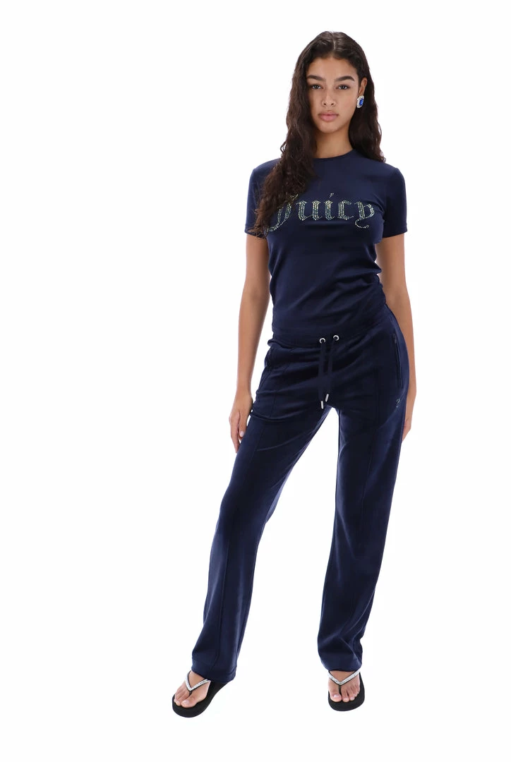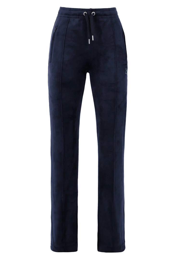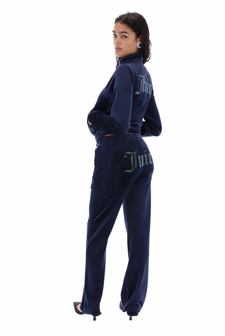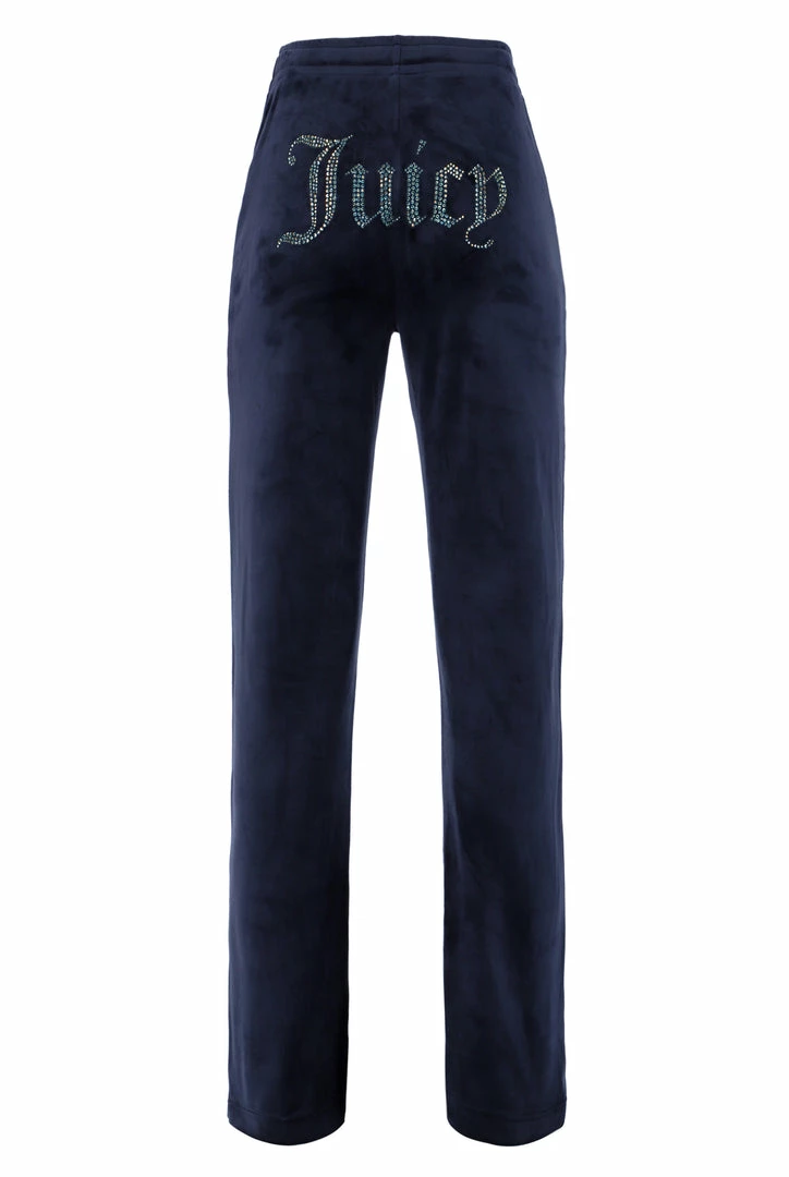 Straight leg diamante embellished tracksuit bottoms in night sky navy blue classic velour. Mid-rise fit, with adjustable drawstring waist and pin tucks through front leg. These bottoms feature zip pockets, statement crystal diamante branding on the back and silver branded hardware. Pair with the matching track top for a full iconic Juicy Couture tracksuit.