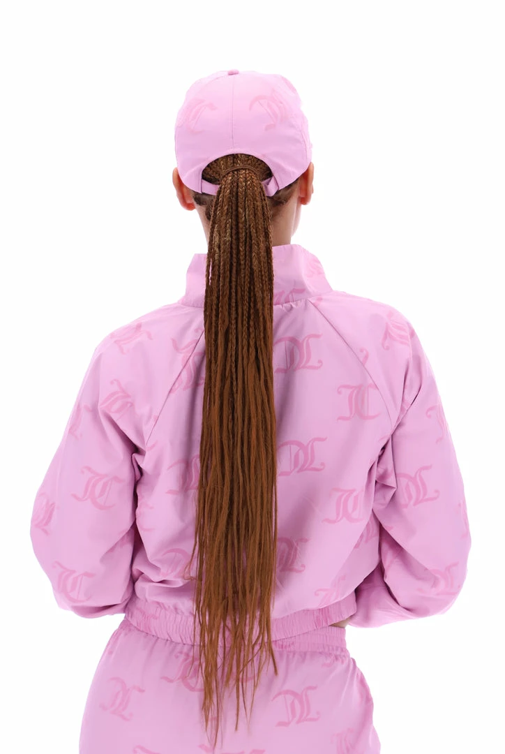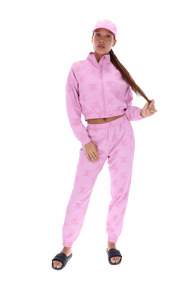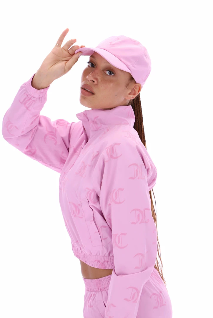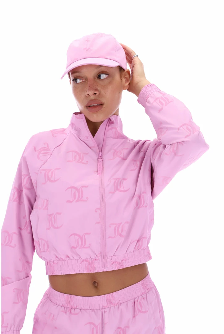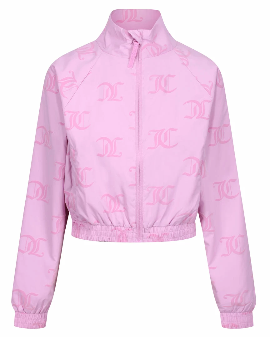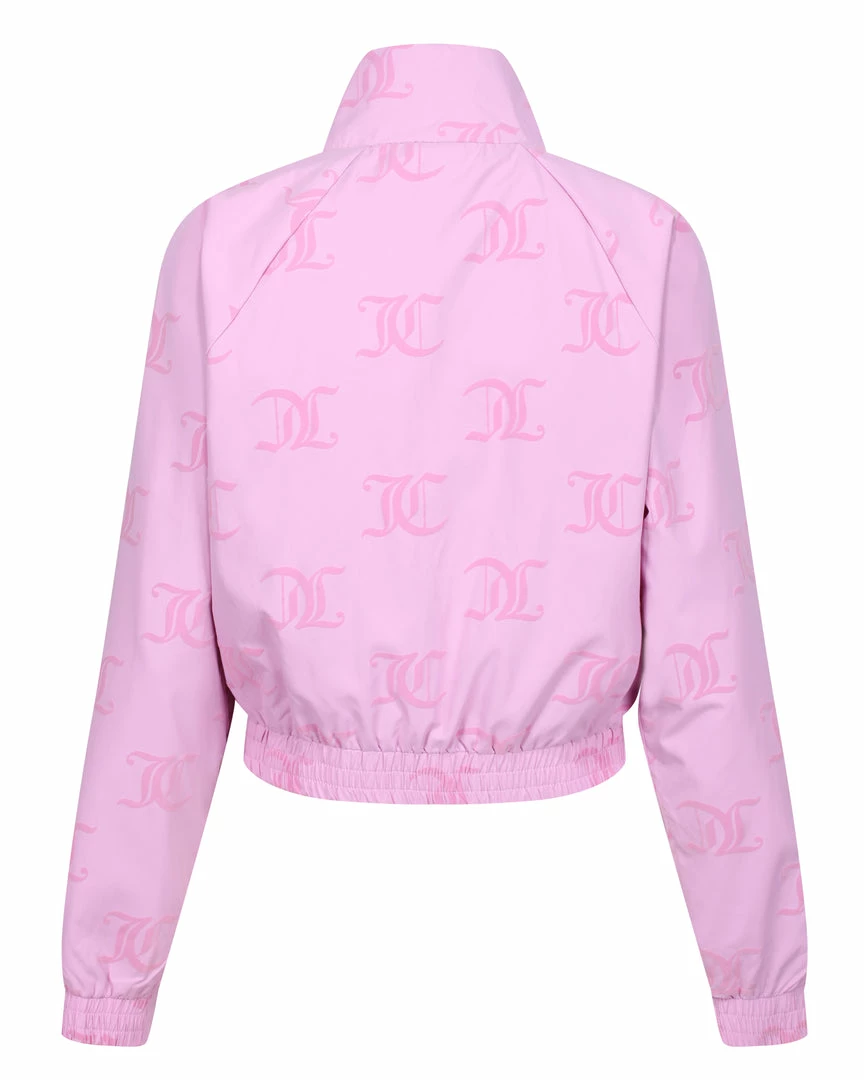 Printed monogram track jacket in orchid pongee. A nod to the shell suit, this lightweight woven track jacket is branded with tonal flocked printed JC monogram. Featuring a smocked waist band and cuffs, the jacket is finished with a funnel neck and silicone zip pull. Pair with the matching shorts or joggers for a relaxed sports look.