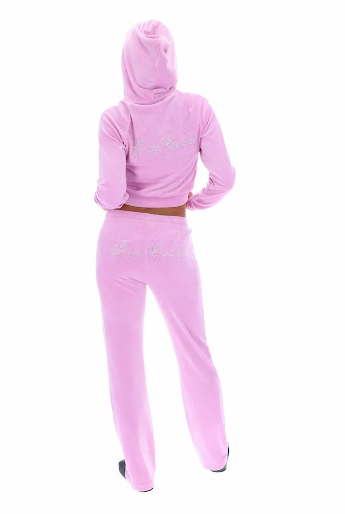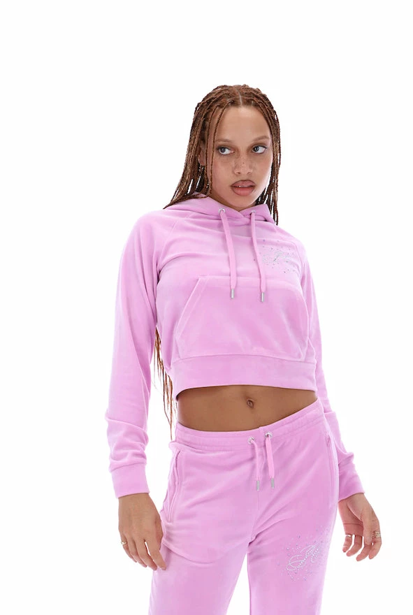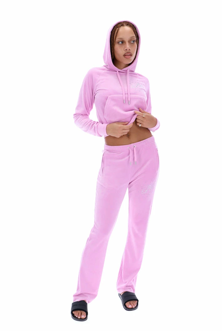 Slim-fit diamante embellished hoodie in orchid classic velour. This pullover hoodie features a front kangaroo pocket, diamante JC script logo at chest, statement script Juicy Couture diamante branding at back and is finished with silver branded hardware. Pair with the matching bottoms for a full iconic Juicy Couture tracksuit.
