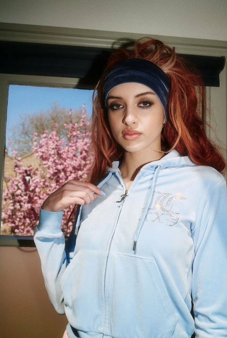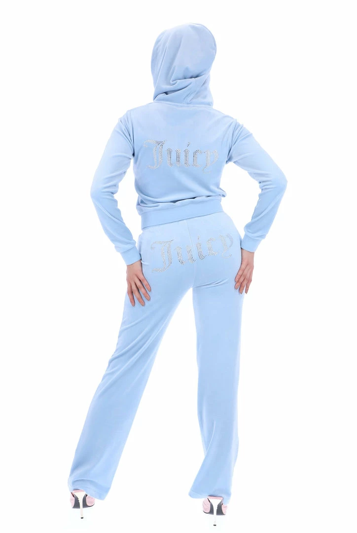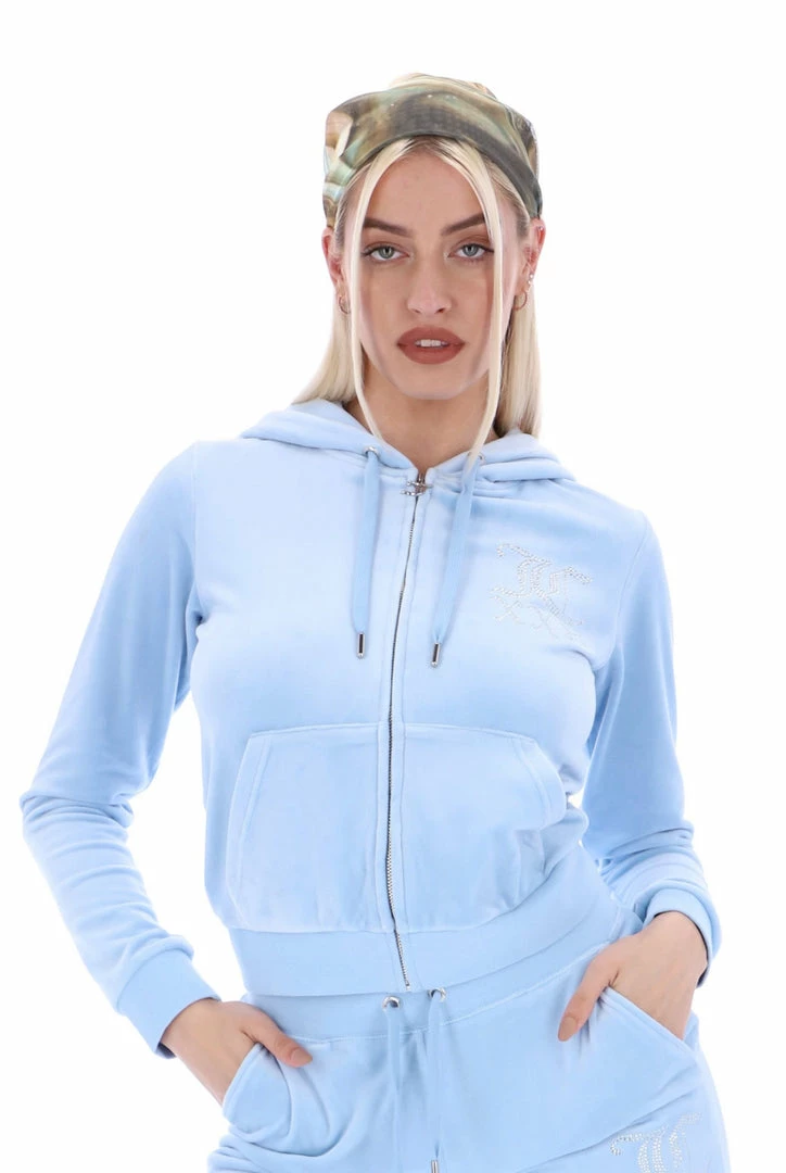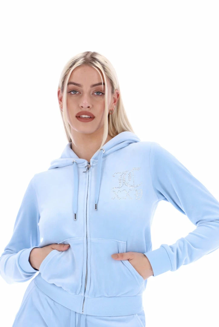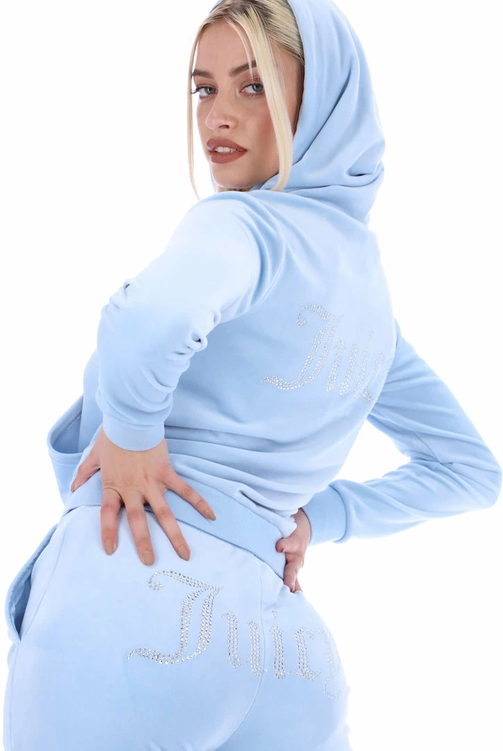 Celebrating 25 years of our iconic tracksuit; an anniversary diamante zip through hoodie in powder blue classic velour. Slim fit, with kangaroo pockets; this commemorative hoodie features a ’25’ numeral statement diamante graphic on chest and Juicy diamante logo on back. Honouring the silver milestone anniversary, this hoodie is finished with a silver neck tag, gothic J zip pull and a self-fabric lined hood.