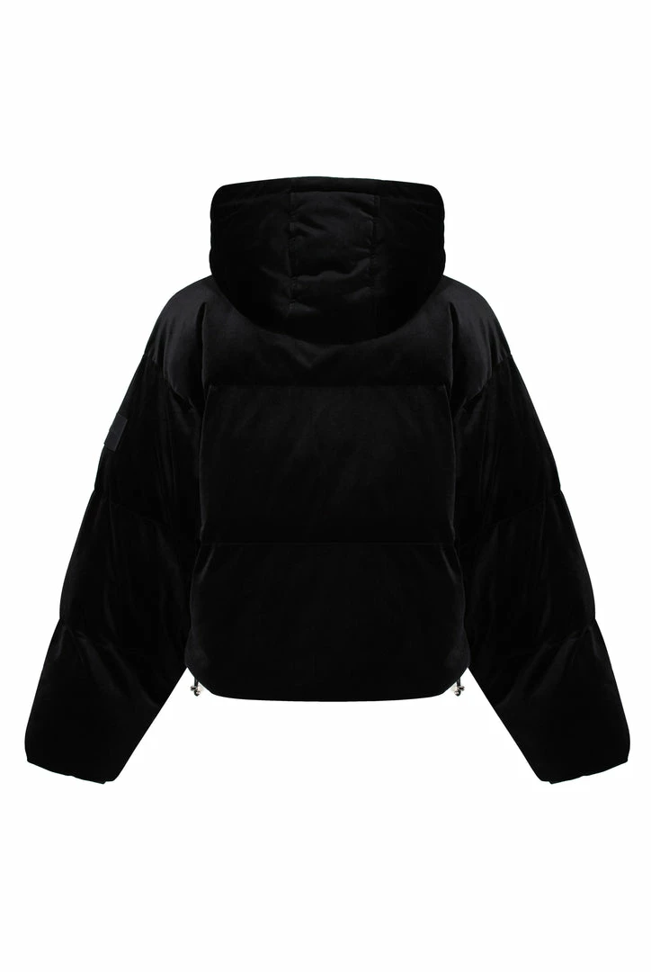 Oversized cropped puffer jacket in classic velour. This puffer features an oversized removable hood with a deep funnel neck and a tonal rubber embossed branded patch on sleeve. With a synthetic down filling, the coat is also fully lined and features adjustable bungee cords at the waist and hood. A centre front zip and poppers at the hood fastens the puffer. The coat is finished with concealed ribbed cuffs, popper fastening pockets at hip and branded silver hardware.