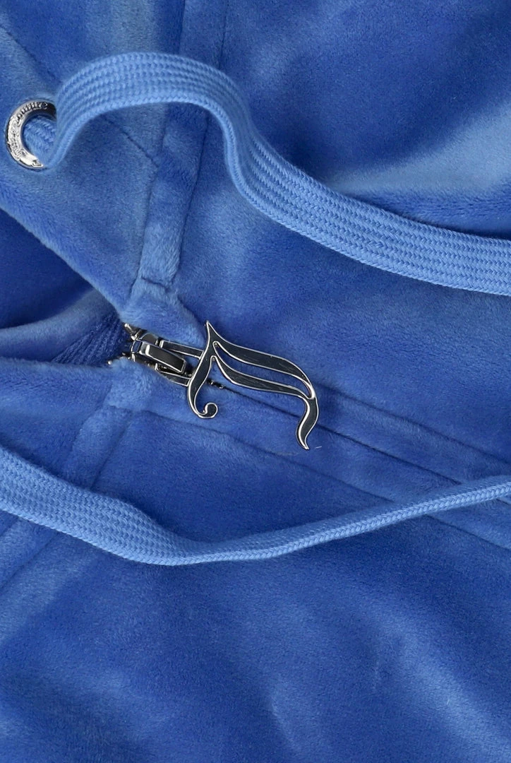 Diamante embellished hoodie in ultramarine classic velour. Slim fit zip-through style with a hood, front pockets, and a statement crystal diamante logo branding on the back. This hoodie is finished with a silver gothic J zip pull and a contrast stripe detailing through arm. Pair with the matching bottoms for a full iconic Juicy Couture tracksuit.