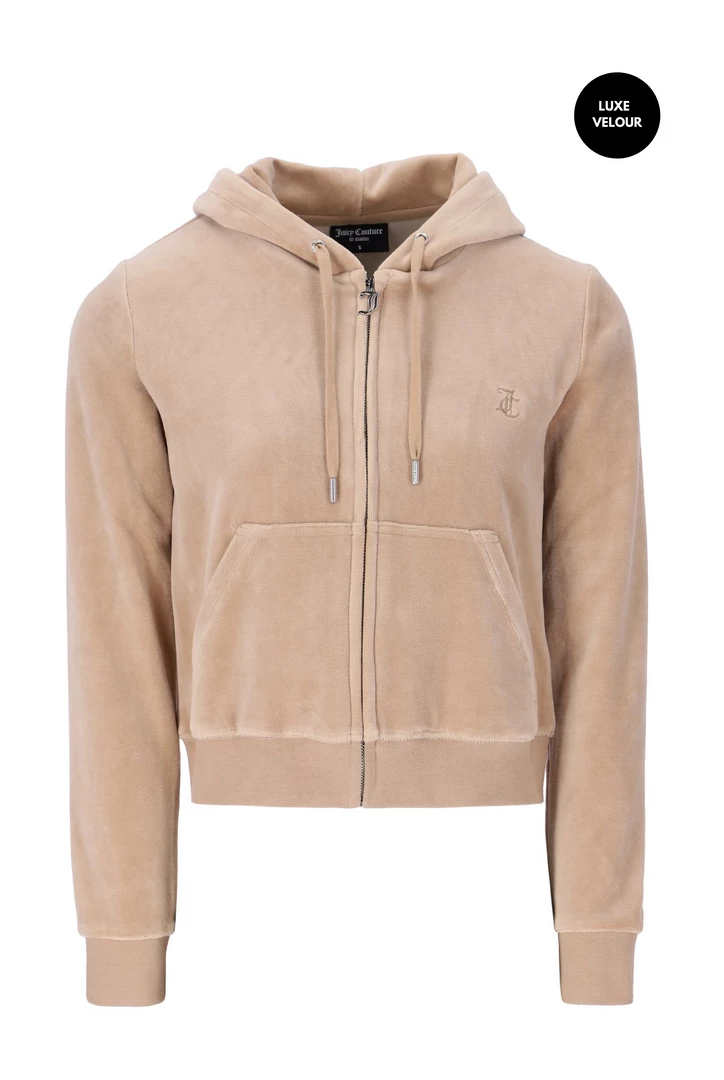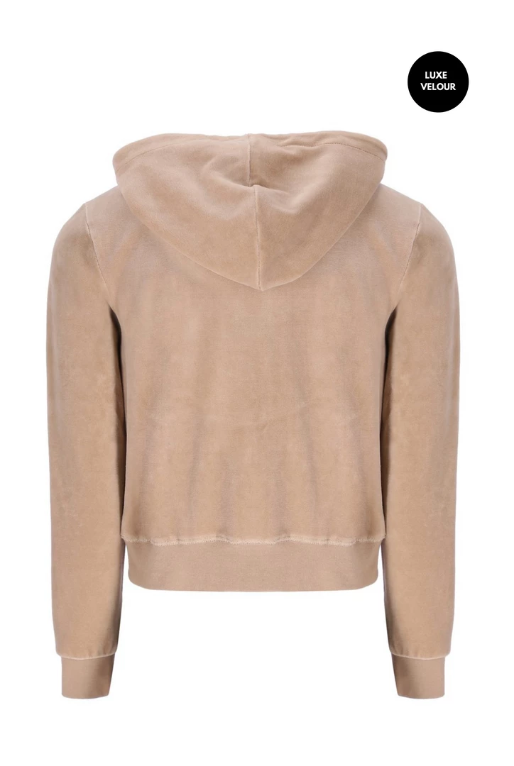 Our legendary zip through staple hoodie in warm taupe luxe cotton rich velour; the original Juicy Couture fabrication. Part of the Black Label collection; slim fit, with kangaroo pocket and a self-fabric lined hood, this hoodie features a statement gothic J zip pull and is branded with a tonal embroidered JC logo at the chest. Pair with the matching bottoms for the full tracksuit fit; celebrating 25 years of the icon.