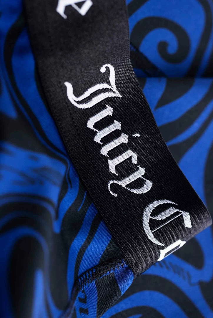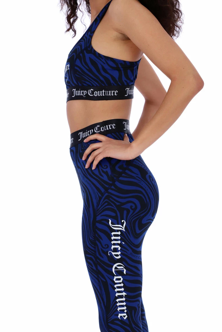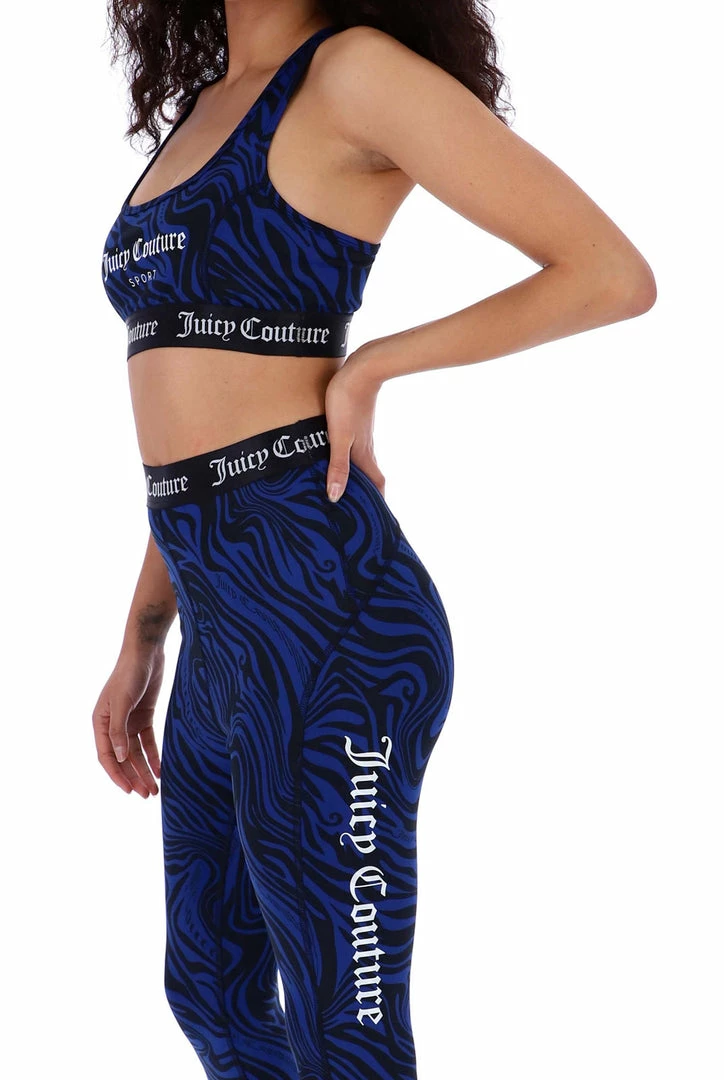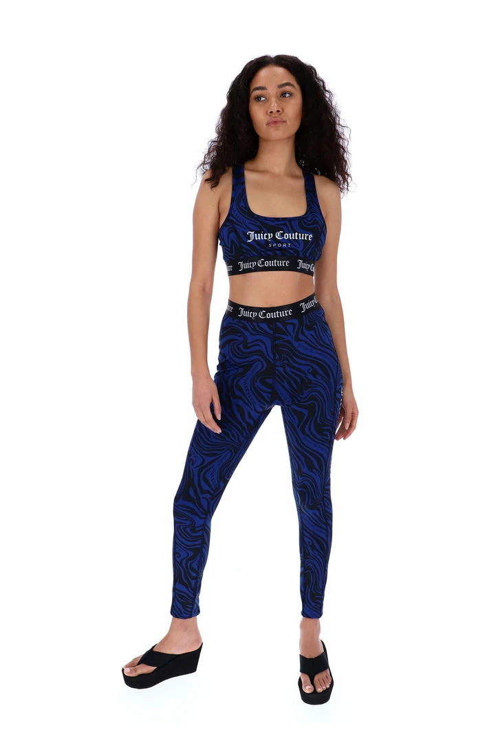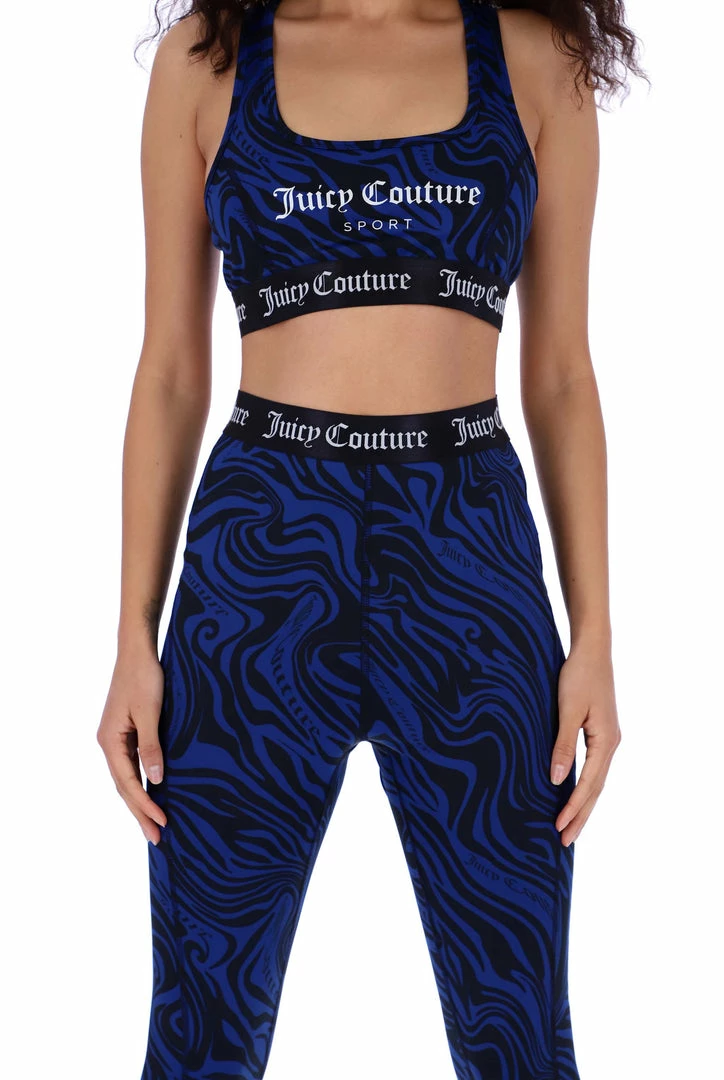 Low impact sports bra in wave printed performance style interlock jersey. This bra features printed Juicy Couture branding through chest, racer back cut and princess seams for sculpted fit and is finished with a branded jacquard elastic through hem. Pair with the matching leggings for a full graphic wave printed sports look.
