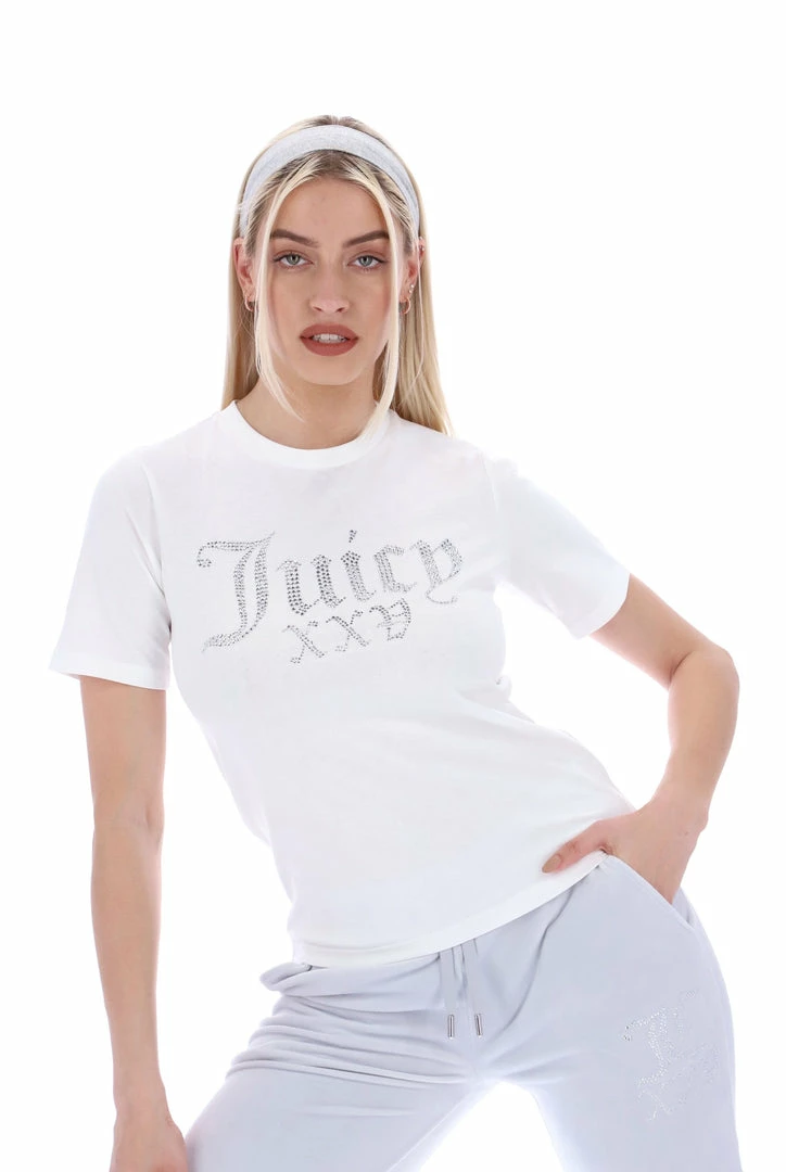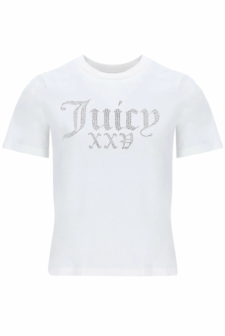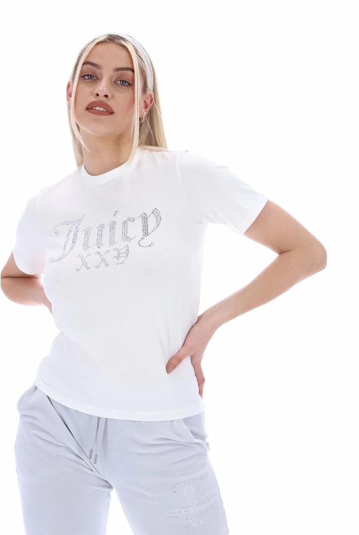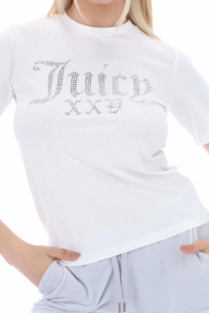 Celebrating 25 years of our iconic tracksuit; white short sleeve numeral diamante girlfriend tee. This crew neck is branded with a diamante ‘Juicy 25’ roman numeral graphic across chest.
