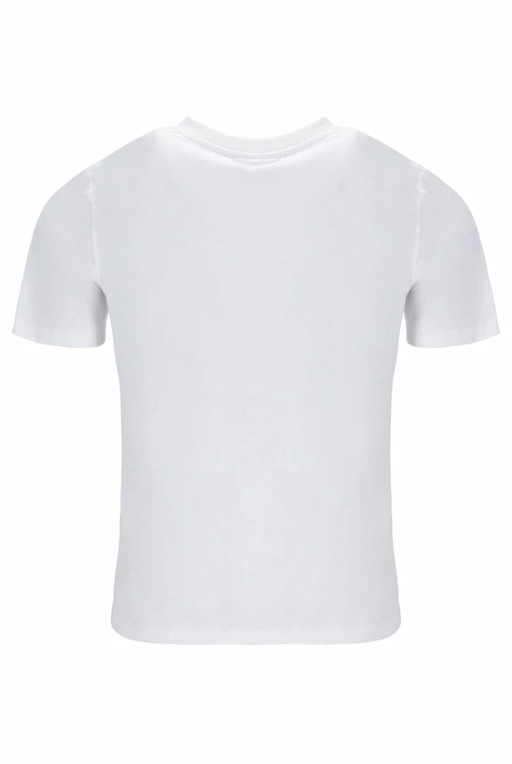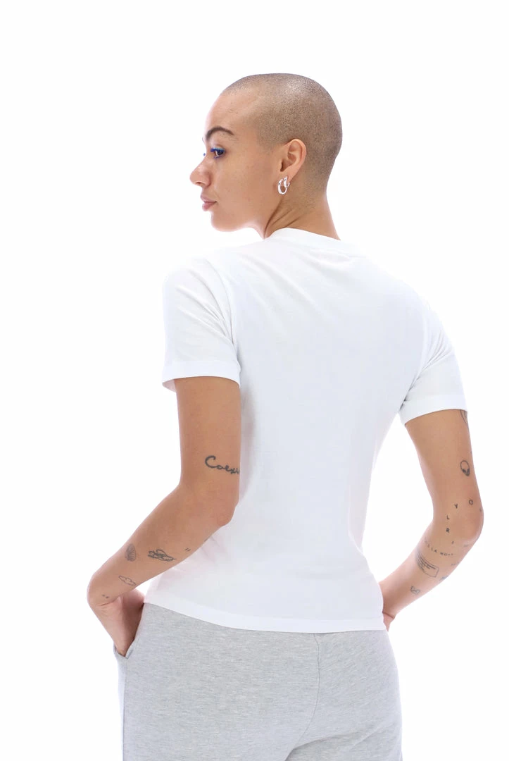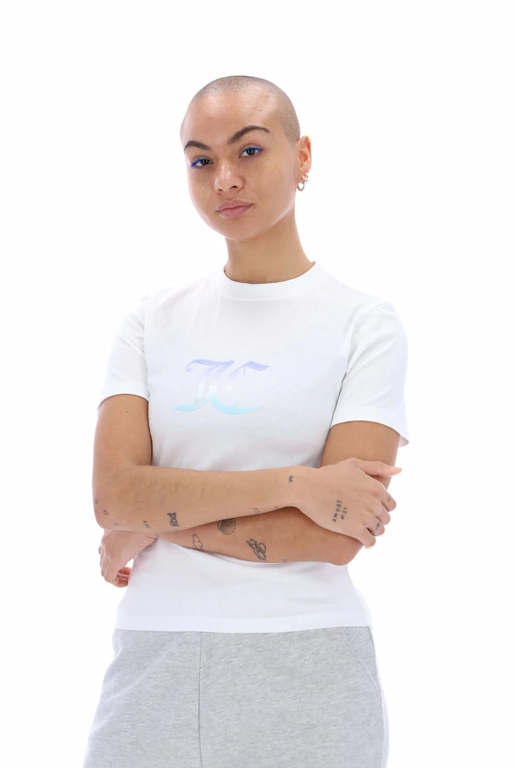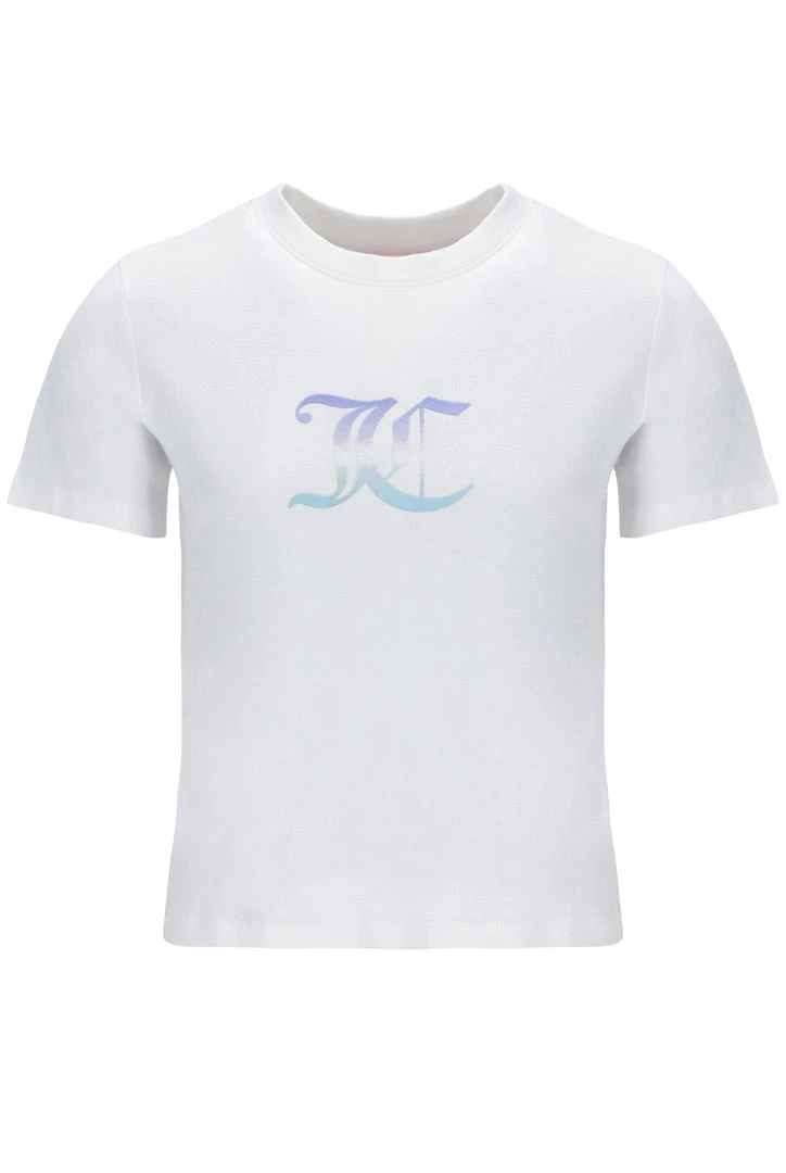 Girlfriend graphic tee in white jersey. This crew neck style t-shirt features a raised outline ‘JC’ ombre branding.